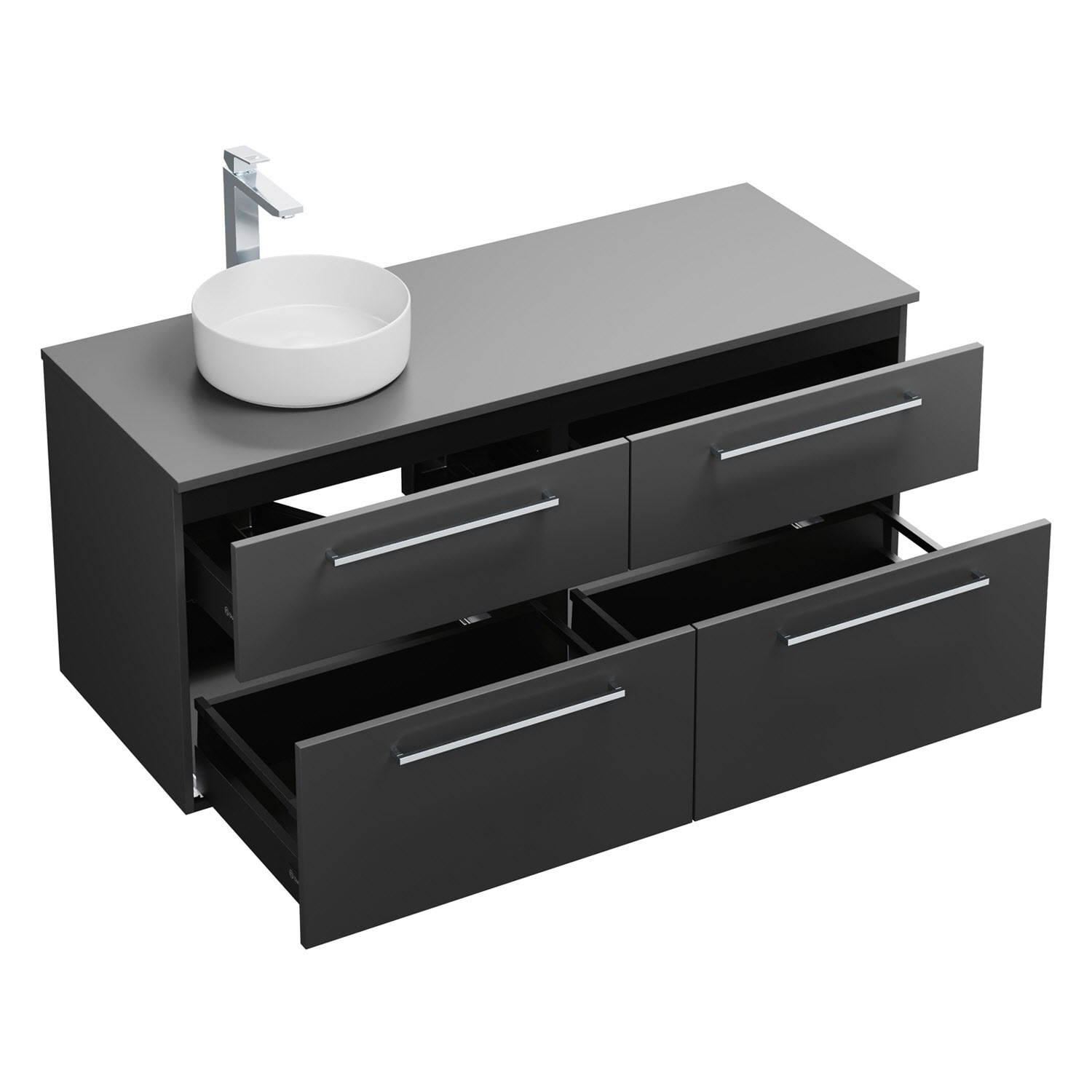 - 2 Schubladen oben, 35 cm tief, mit Siphonausschnitt und Inneneinteilung