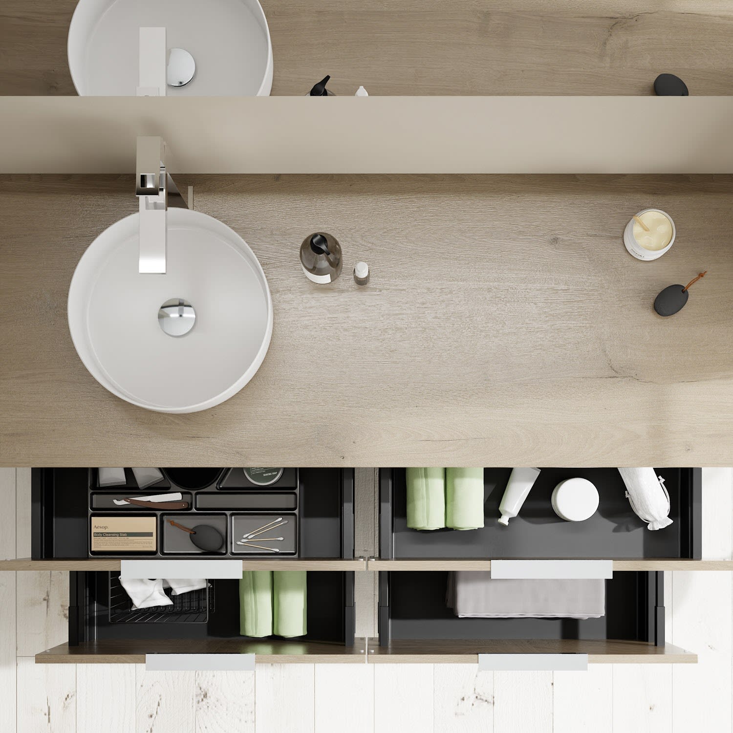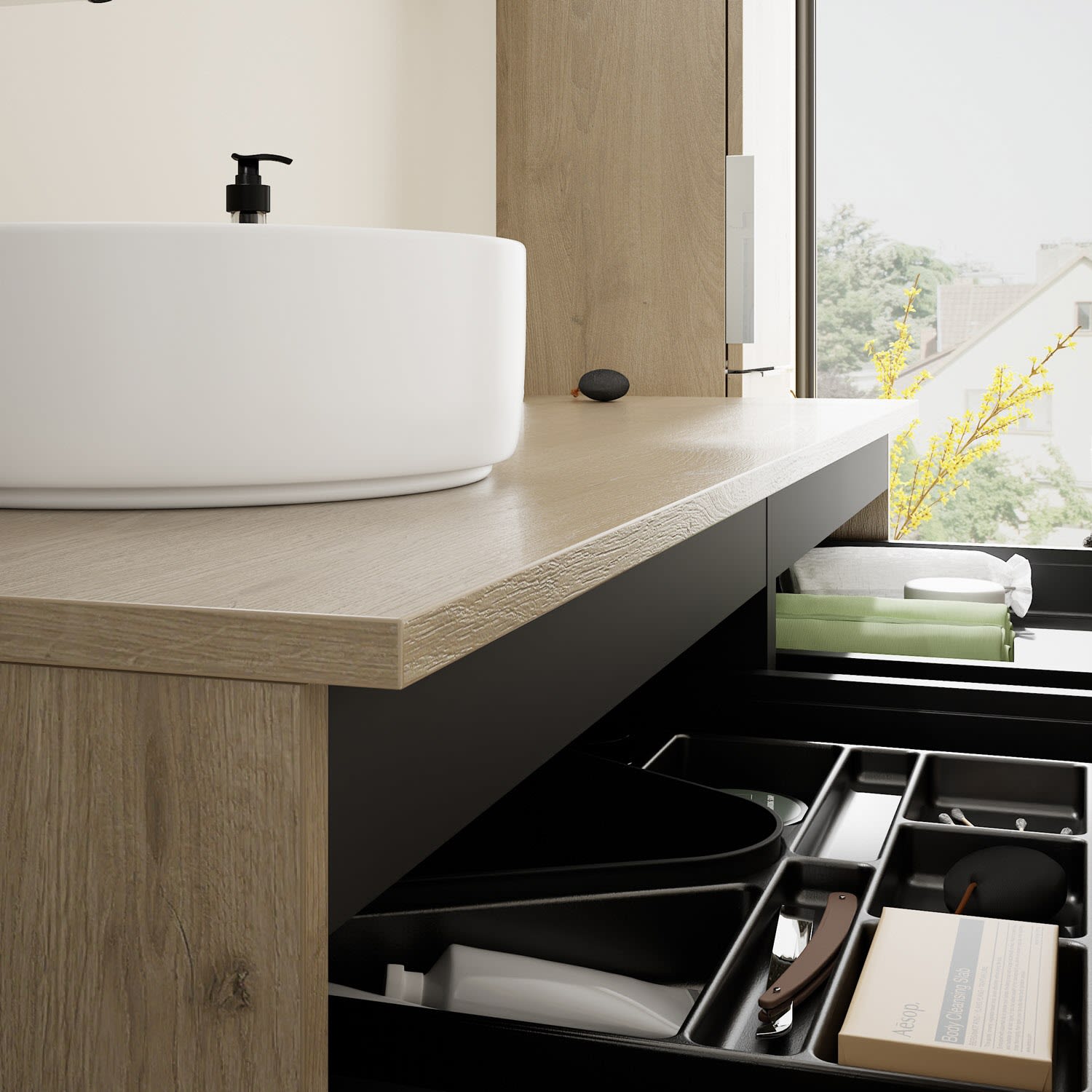 - 2 Schubladen oben, 35 cm tief, mit Siphonausschnitt und Inneneinteilung