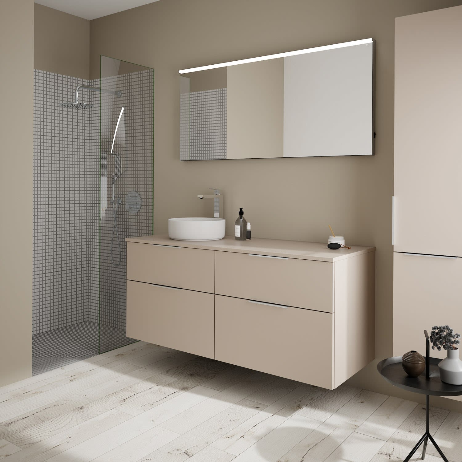 burgbad Eqio Waschtischkombination mit Keramik-Aufsatzwaschtisch 140 cm, links, mit Griff G0146