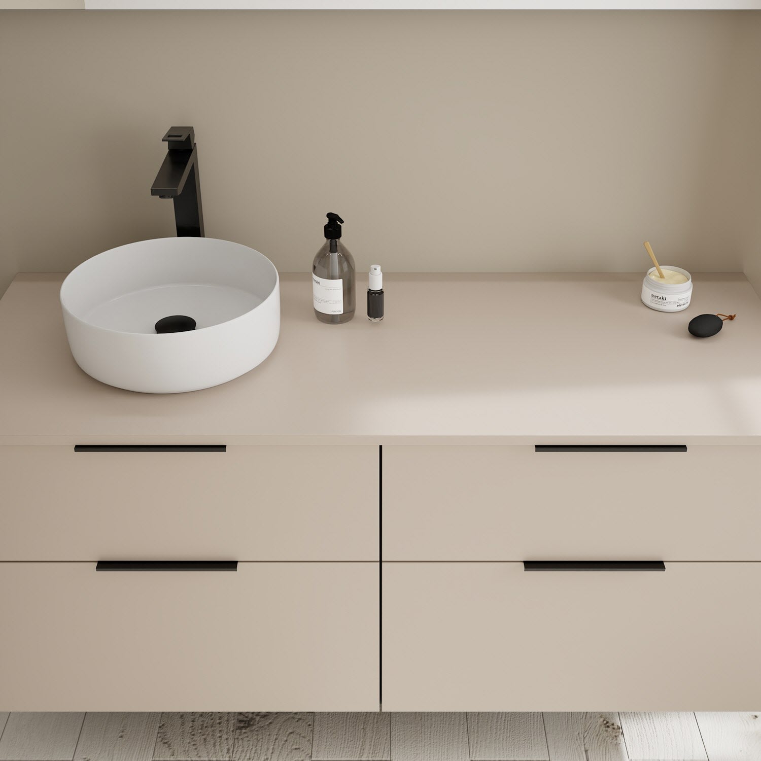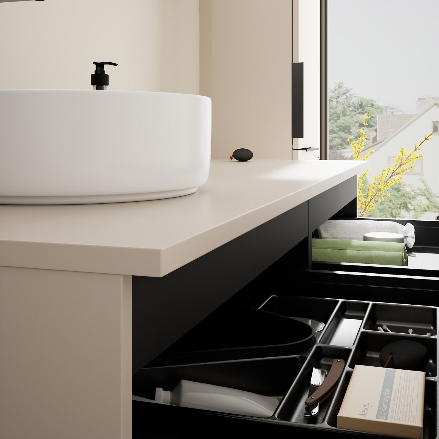 - 2 Schubladen oben, 35 cm tief, mit Siphonausschnitt und Inneneinteilung
