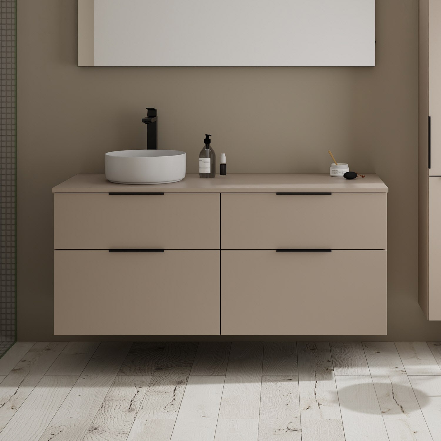 burgbad Eqio Waschtischkombination mit Keramik-Aufsatzwaschtisch 140 cm, links, mit Griff G0200
