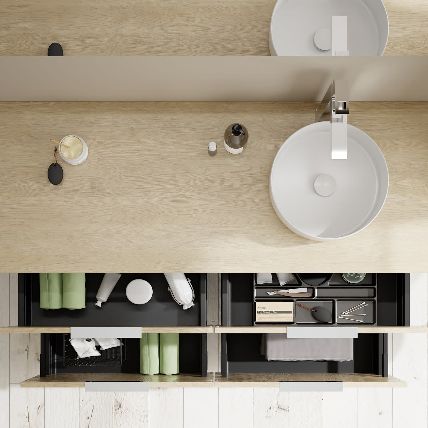 - 2 Schubladen oben, 35 cm tief, mit Siphonausschnitt und Inneneinteilung