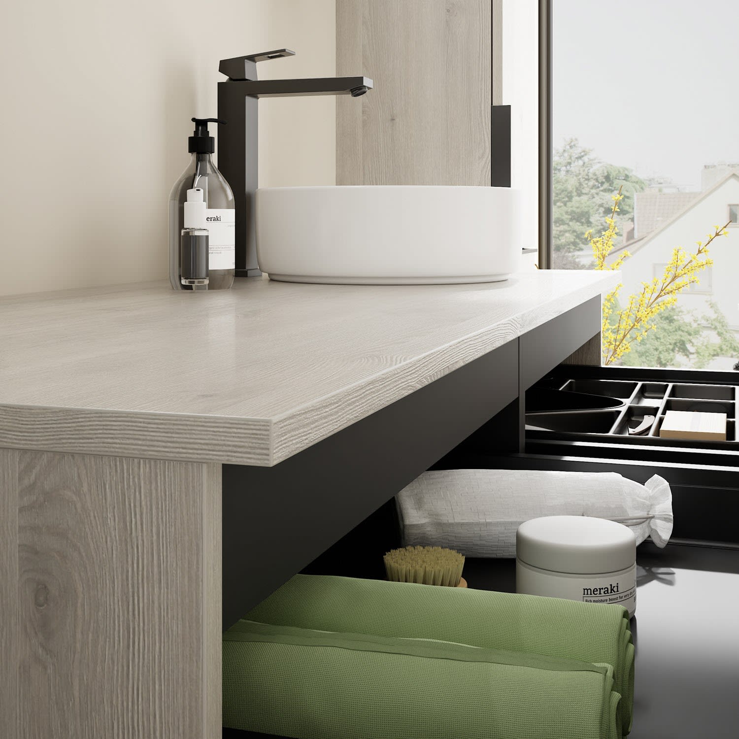 - 2 Schubladen oben, 35 cm tief, mit Siphonausschnitt und Inneneinteilung