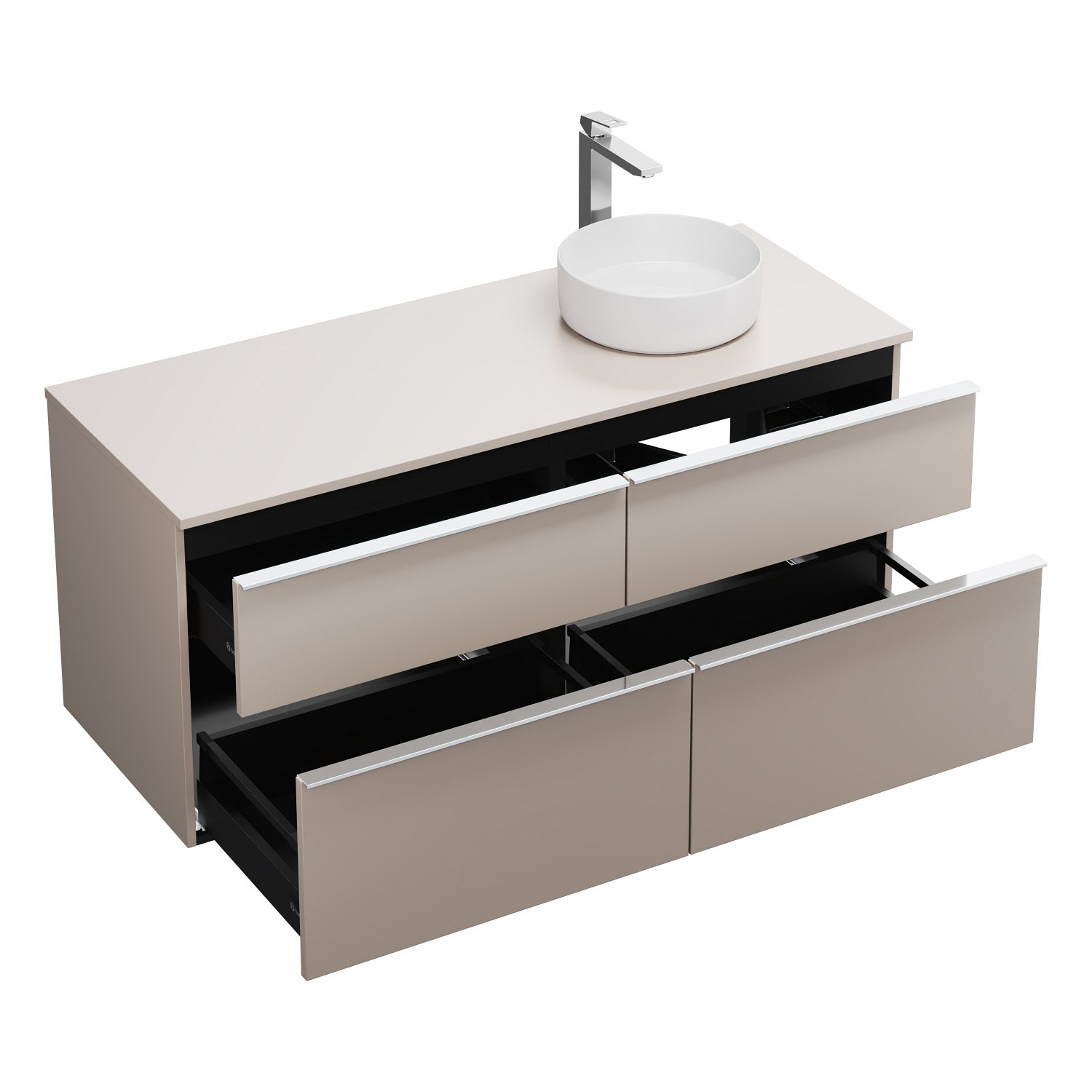 - 2 Schubladen oben, 35 cm tief, mit Siphonausschnitt und Inneneinteilung