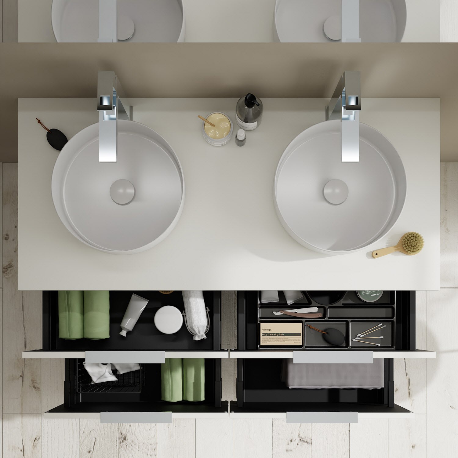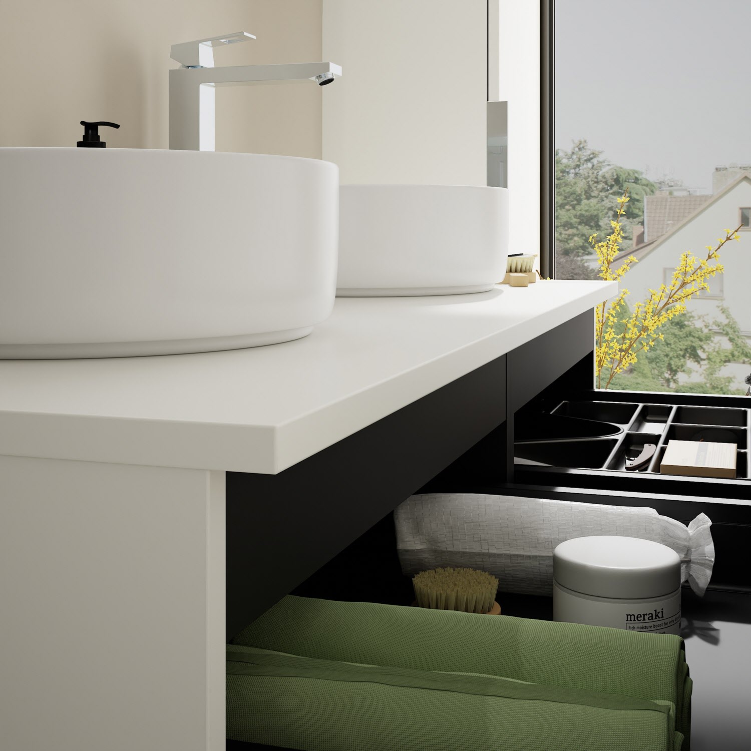 - 2 Schubladen oben, 35 cm tief, mit Siphonausschnitt und Inneneinteilung