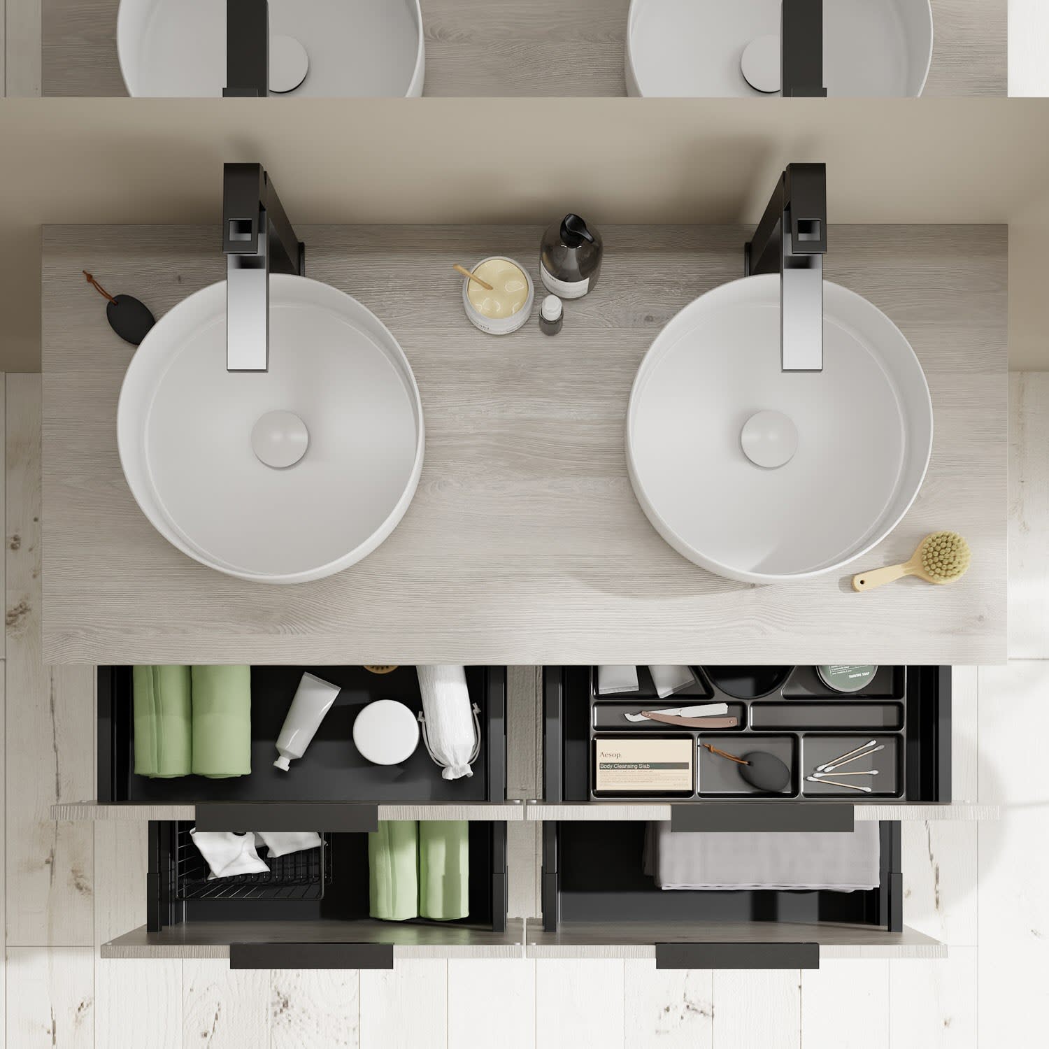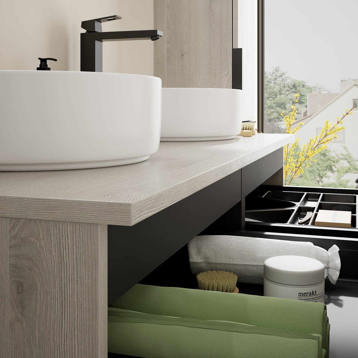 - 2 Schubladen oben, 35 cm tief, mit Siphonausschnitt und Inneneinteilung