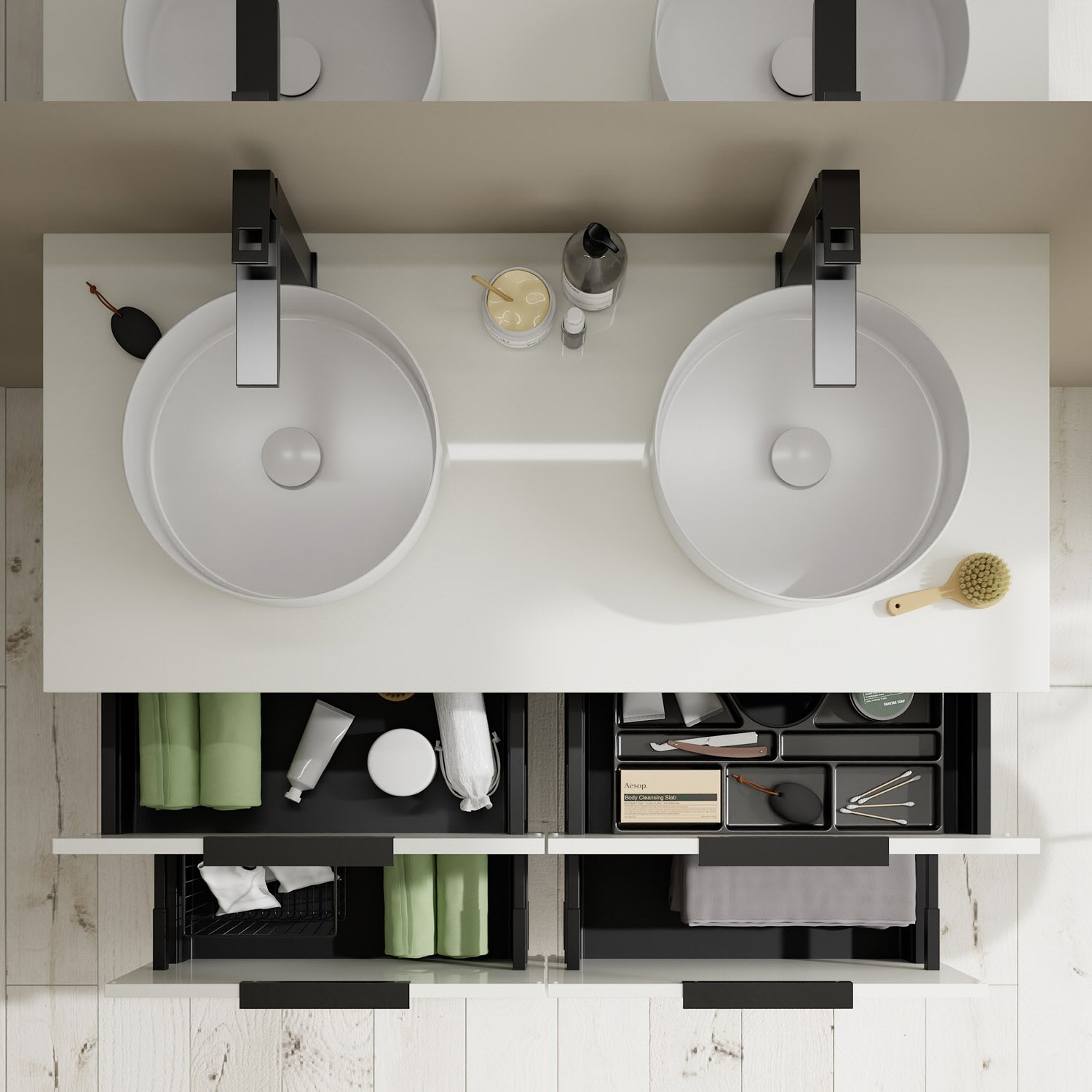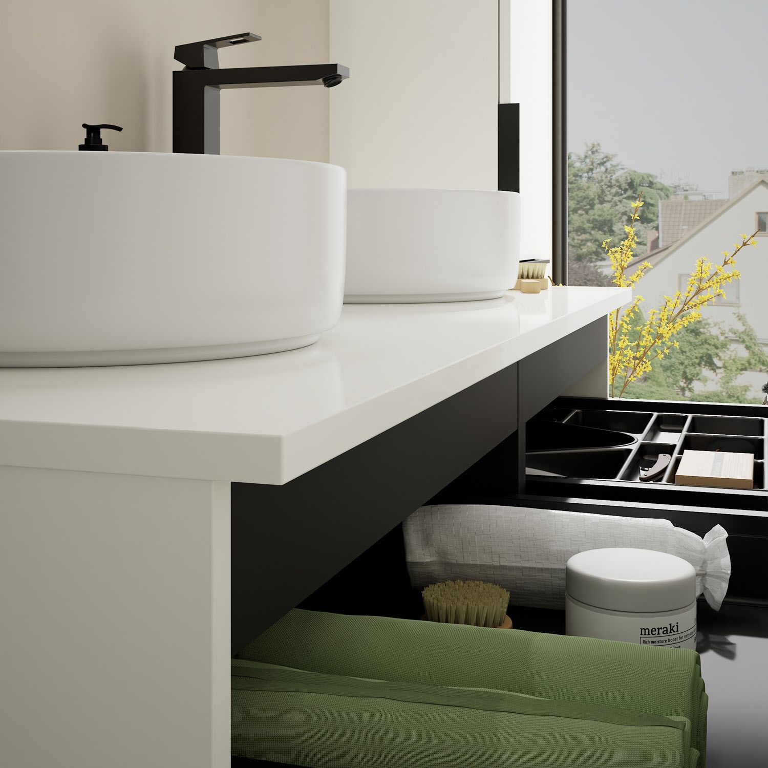 - 2 Schubladen oben, 35 cm tief, mit Siphonausschnitt und Inneneinteilung