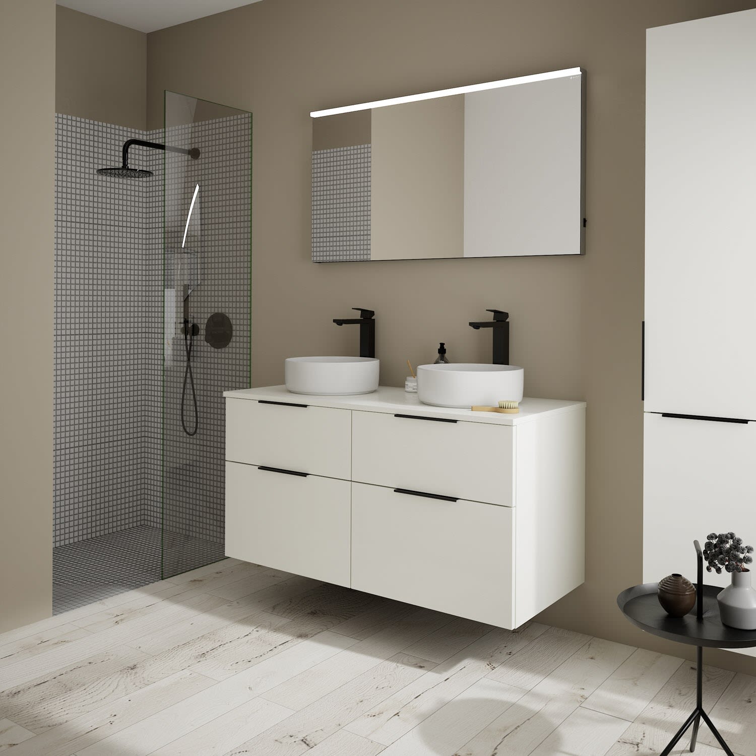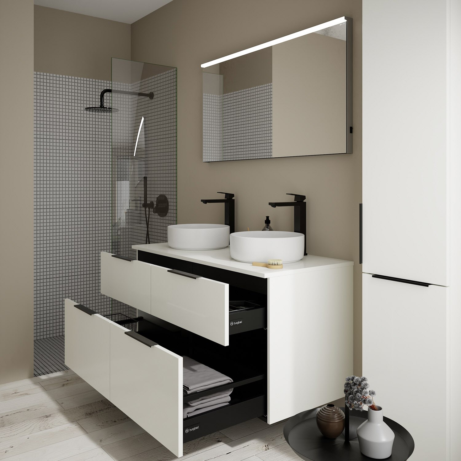 burgbad Eqio Waschtischkombination mit Keramik-Aufsatzwaschtisch 120 cm, links und rechts, mit Griff G0200