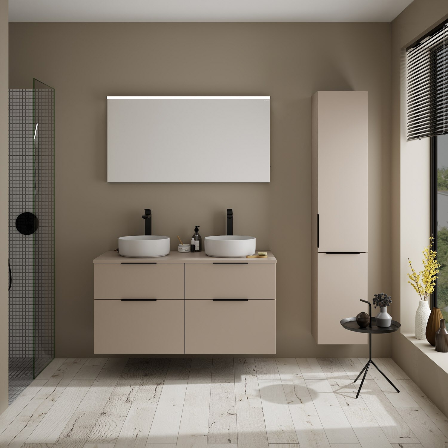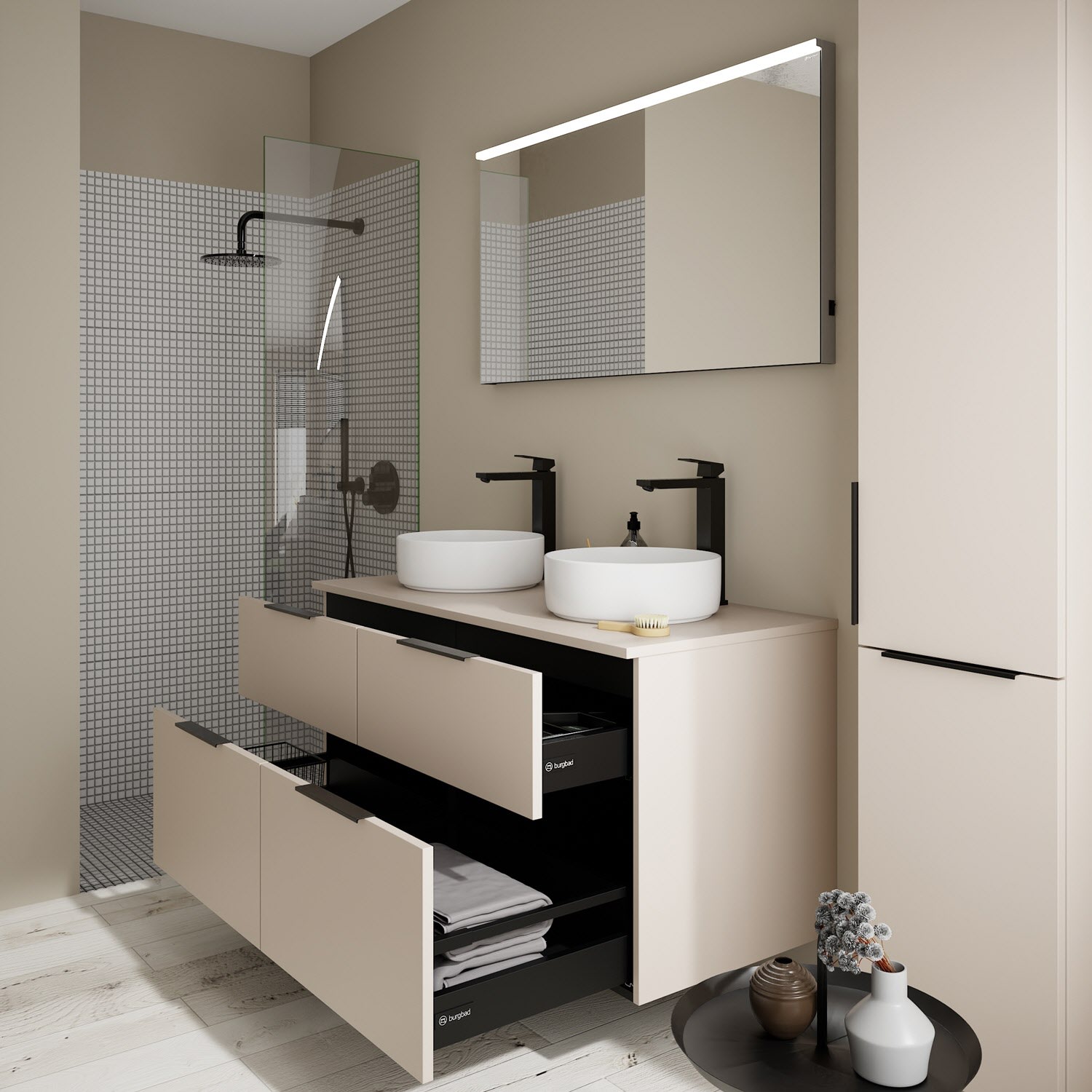 burgbad Eqio Waschtischkombination mit Keramik-Aufsatzwaschtisch 120 cm, links und rechts, mit Griff G0200
