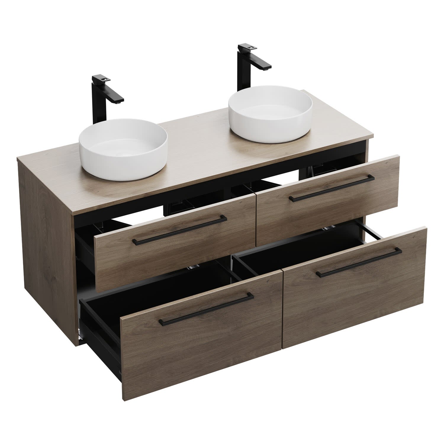 - 2 Schubladen oben, 35 cm tief, mit Siphonausschnitt und Inneneinteilung