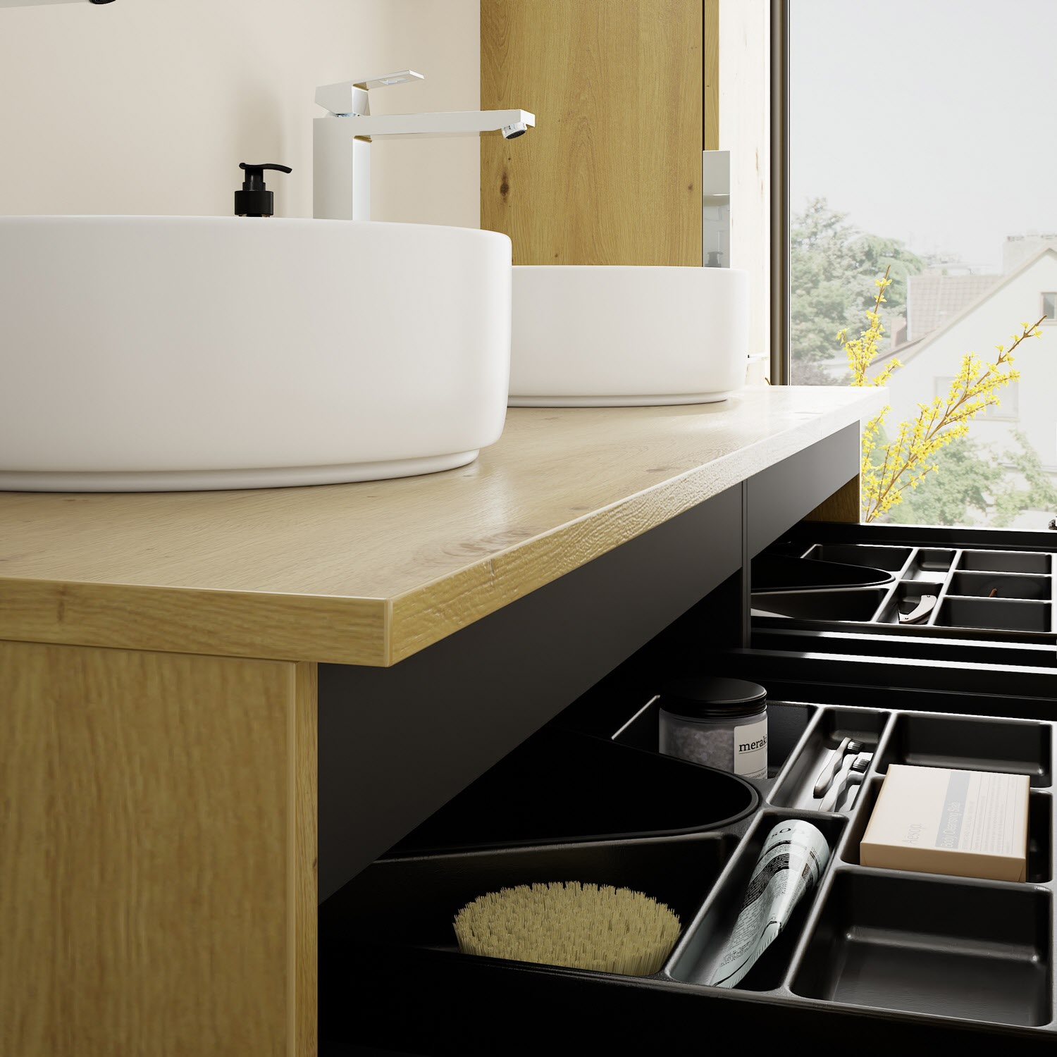 - 2 Schubladen oben, 35 cm tief, mit Siphonausschnitt und Inneneinteilung