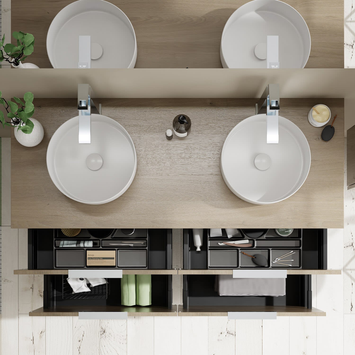 - 2 Schubladen oben, 35 cm tief, mit Siphonausschnitt und Inneneinteilung