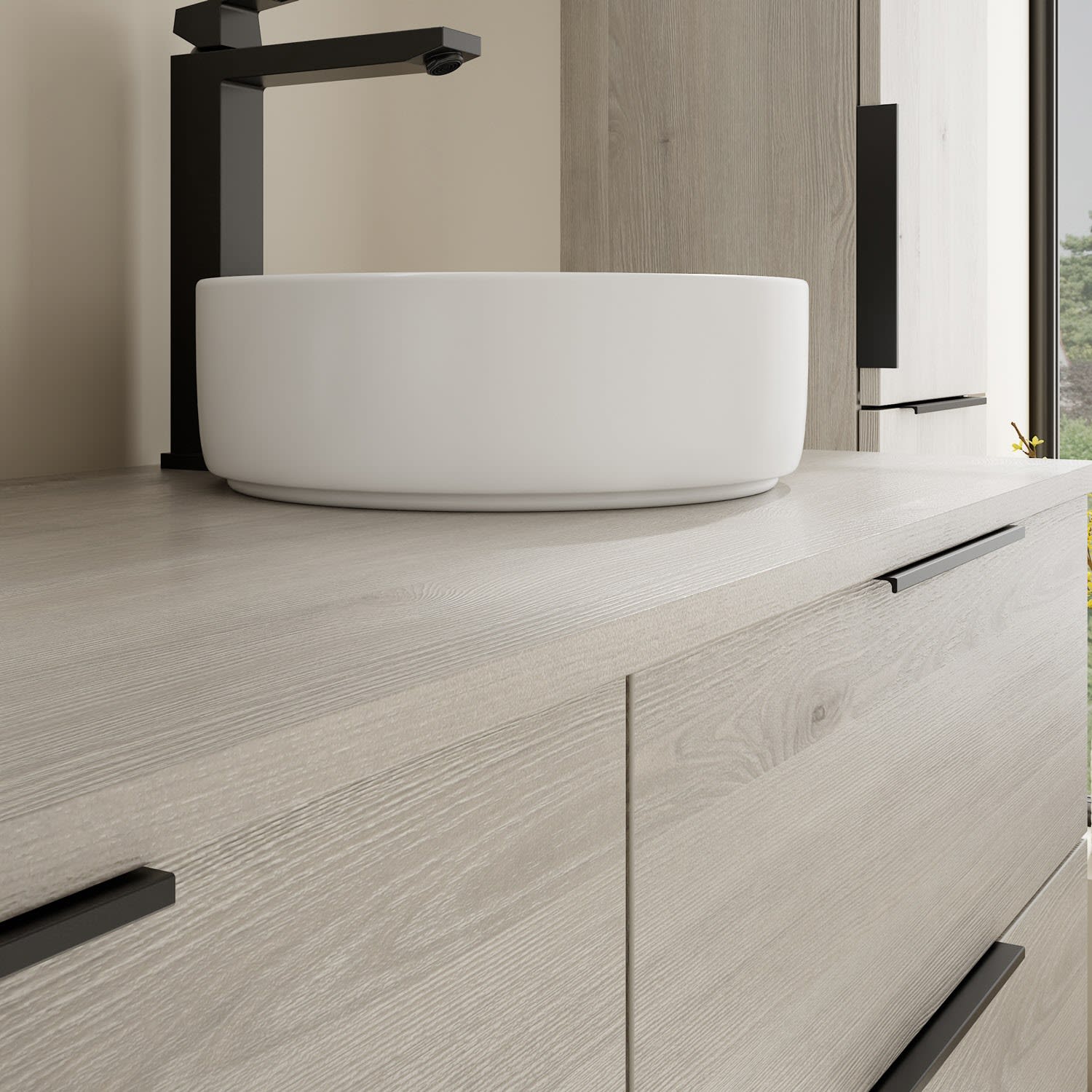 - 2 Schubladen oben, 35 cm tief, mit Siphonausschnitt und Inneneinteilung