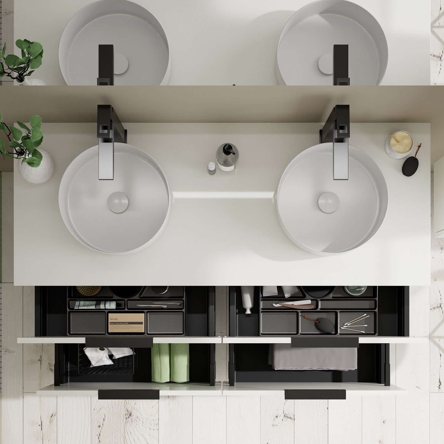 - 2 Schubladen oben, 35 cm tief, mit Siphonausschnitt und Inneneinteilung