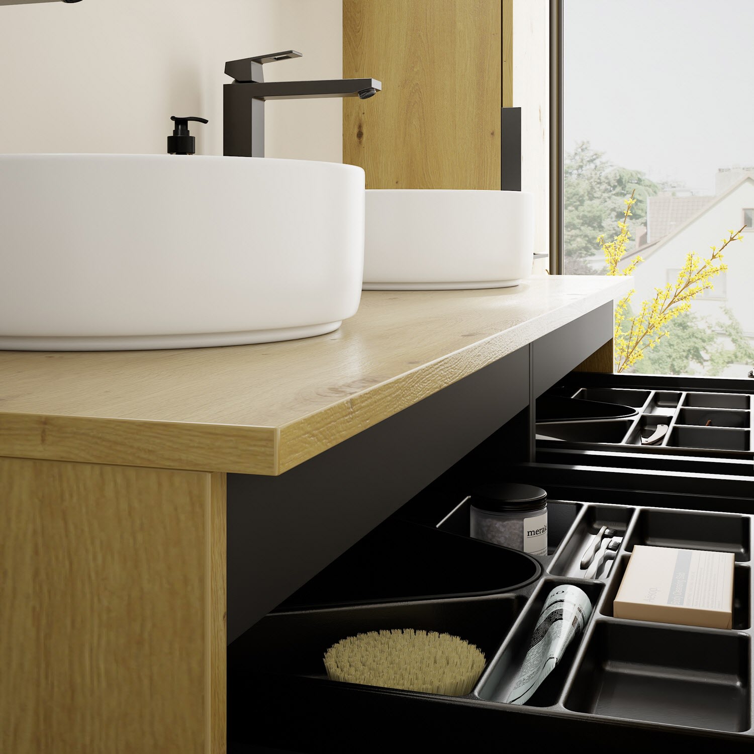 - 2 Schubladen oben, 35 cm tief, mit Siphonausschnitt und Inneneinteilung