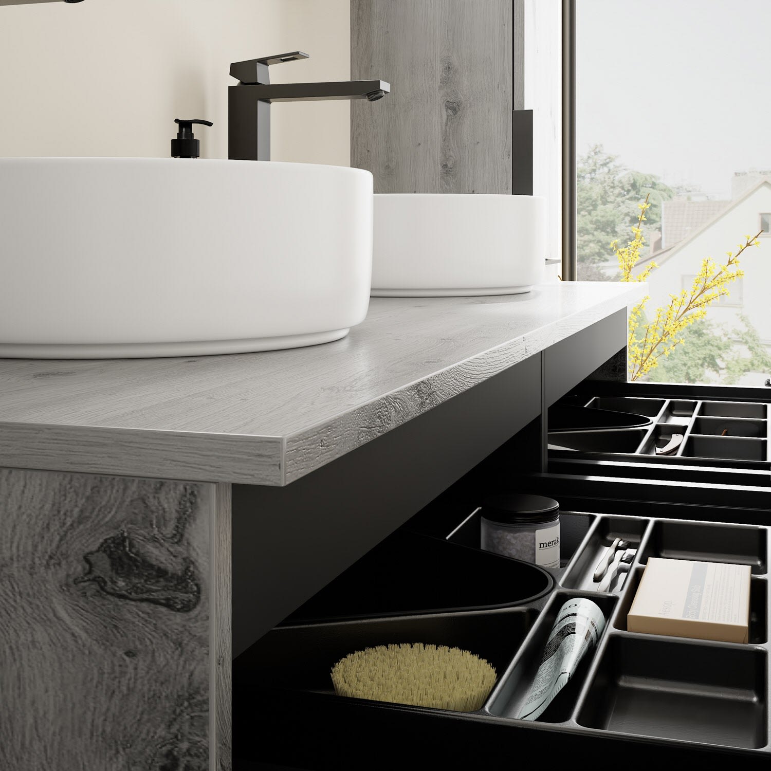 - 2 Schubladen oben, 35 cm tief, mit Siphonausschnitt und Inneneinteilung