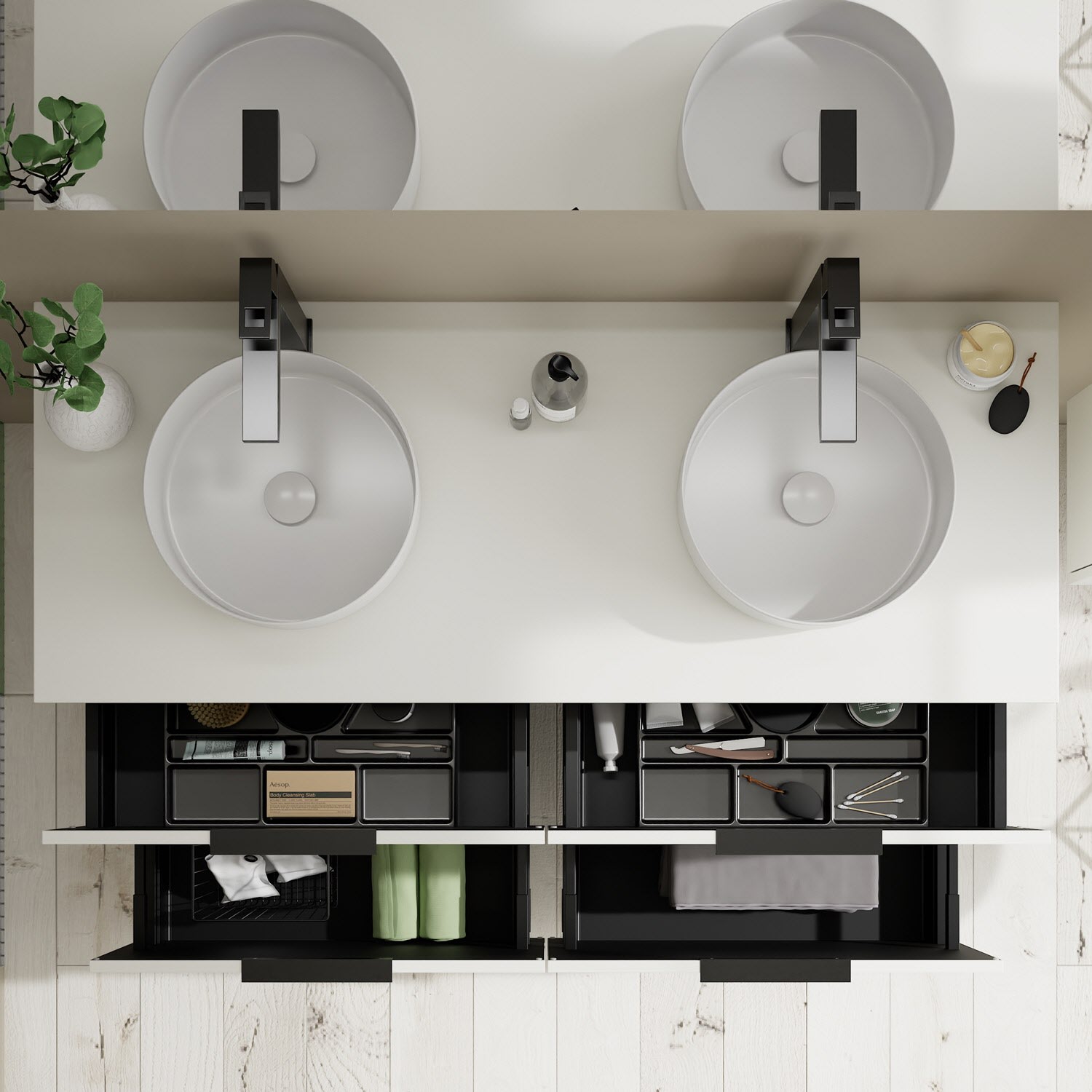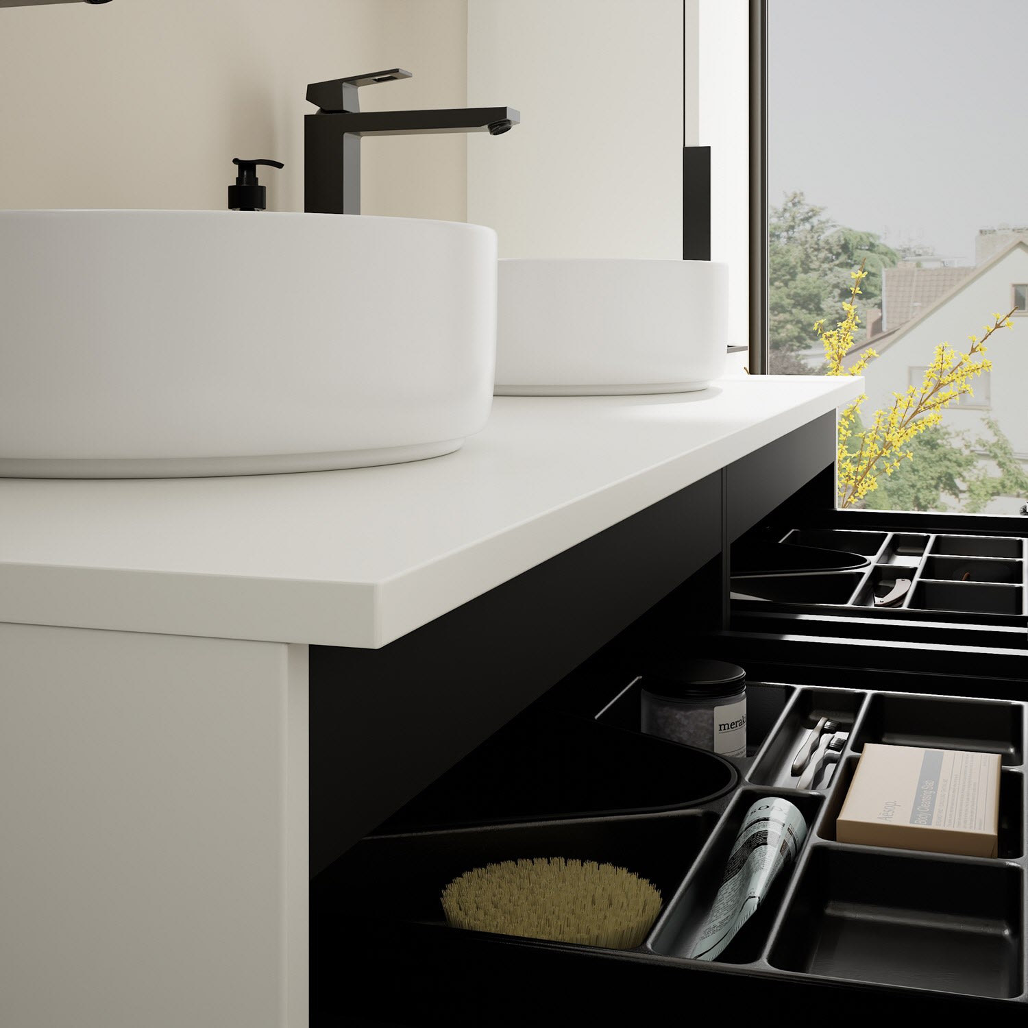 - 2 Schubladen oben, 35 cm tief, mit Siphonausschnitt und Inneneinteilung