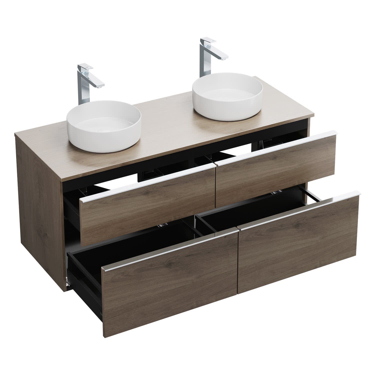 - 2 Schubladen oben, 35 cm tief, mit Siphonausschnitt und Inneneinteilung