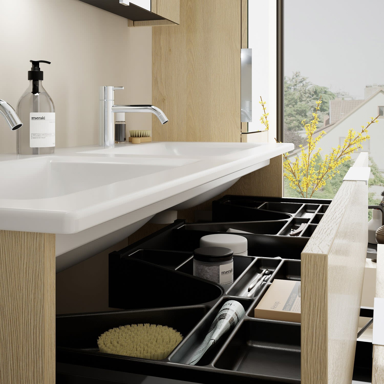 - 1 Schublade oben, 35 cm tief, mit 2 Siphonausschnitten und Inneneinteilung
