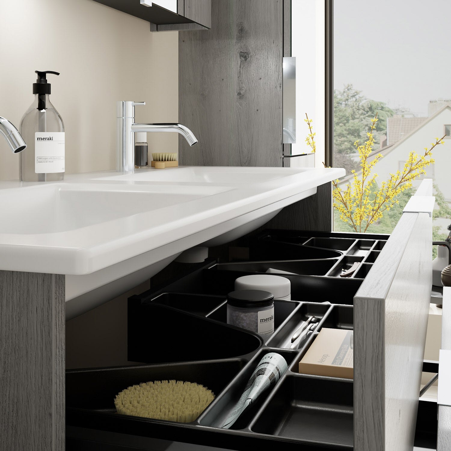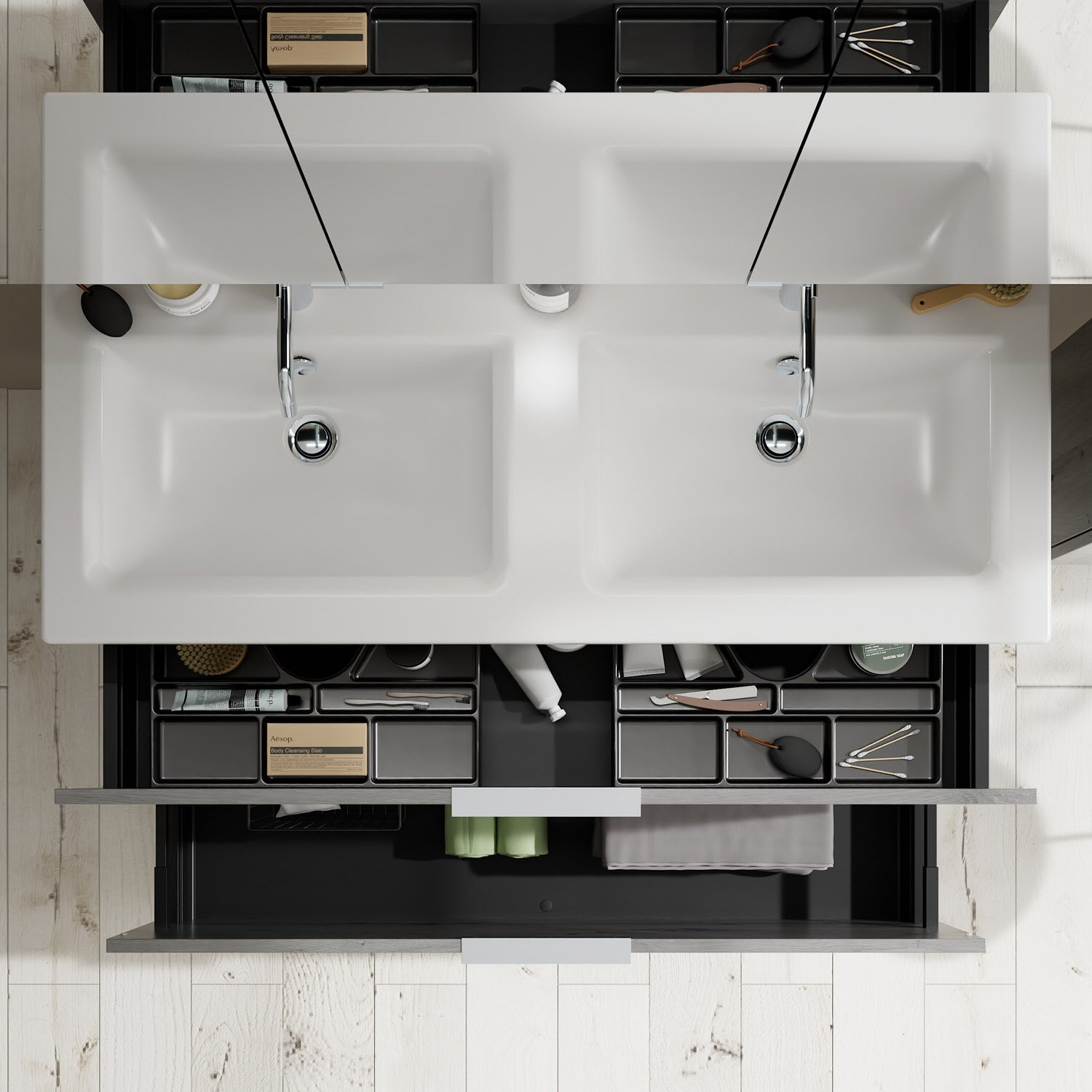 - 1 Schublade oben, 35 cm tief, mit 2 Siphonausschnitten und Inneneinteilung