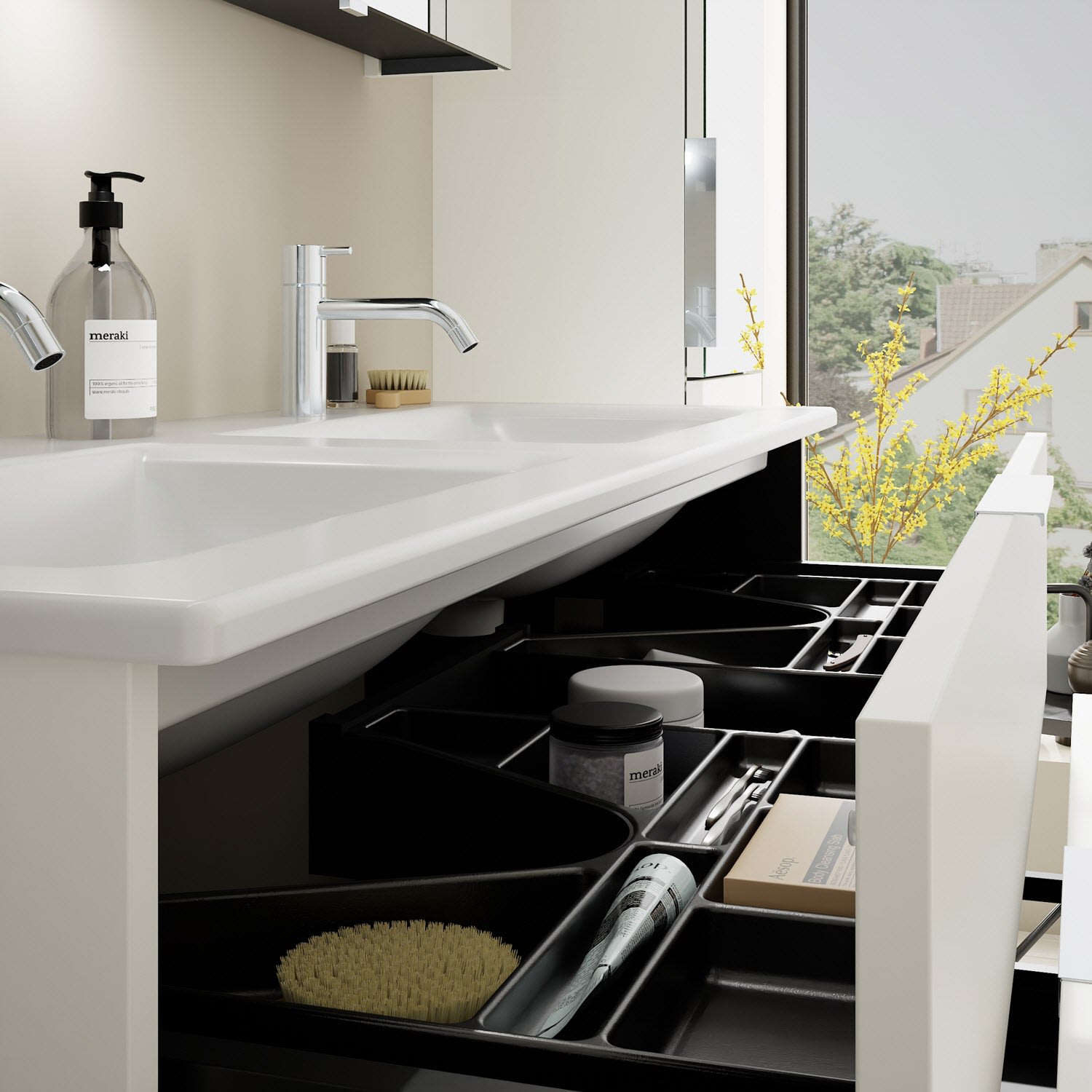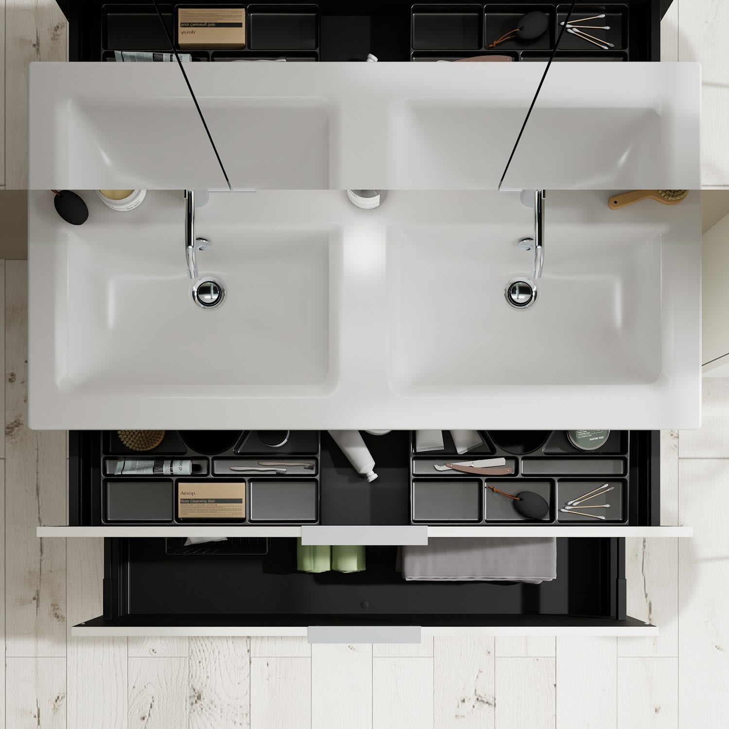 - 1 Schublade oben, 35 cm tief, mit 2 Siphonausschnitten und Inneneinteilung