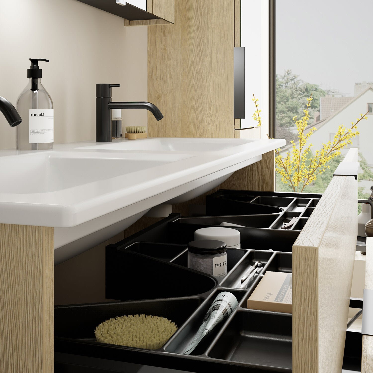- 1 Schublade oben, 35 cm tief, mit 2 Siphonausschnitten und Inneneinteilung