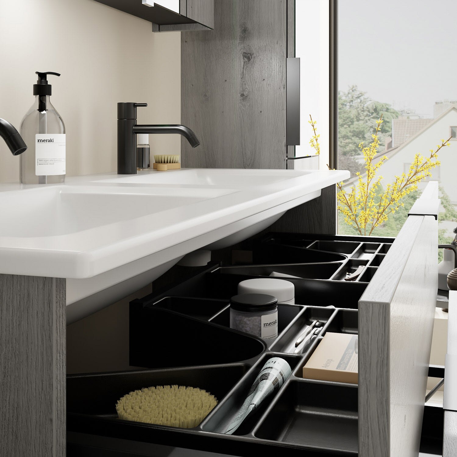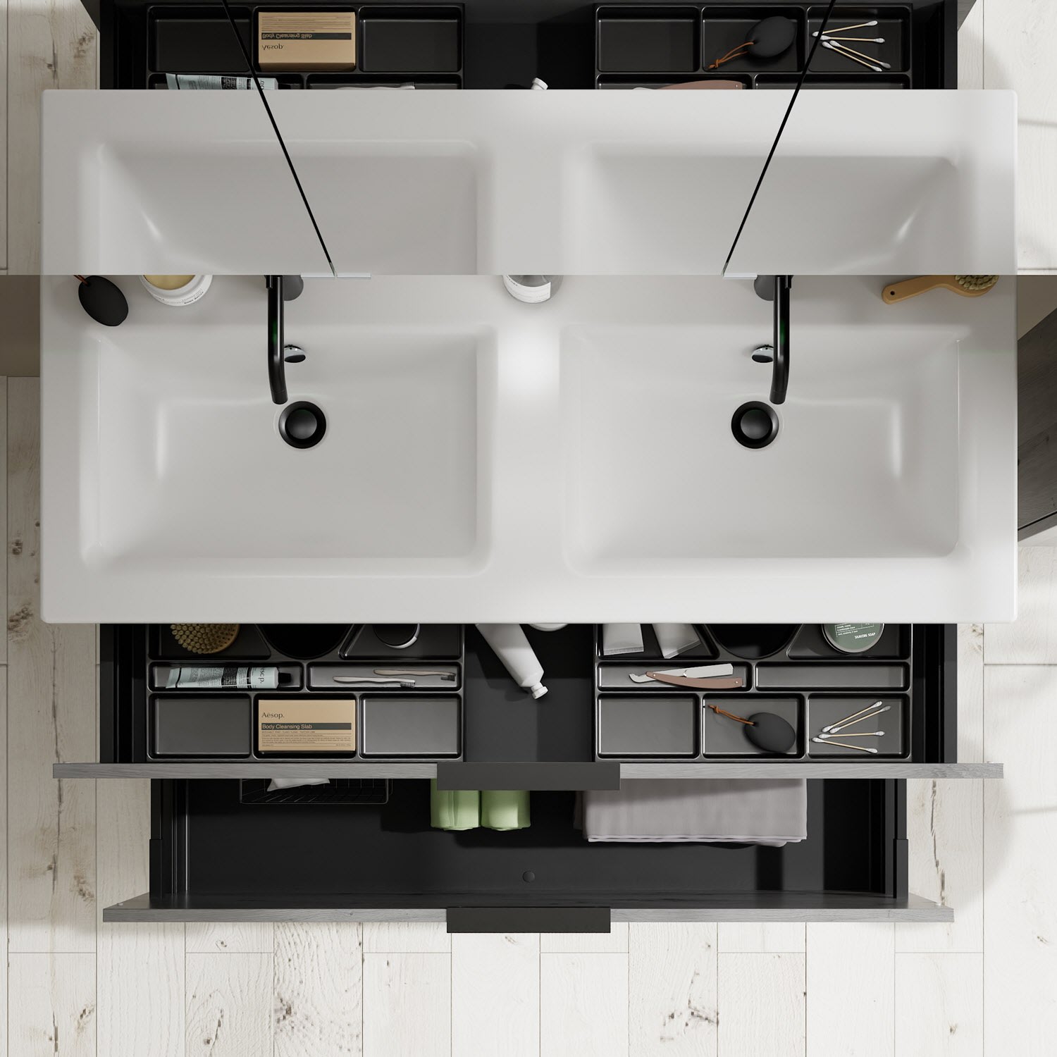 - 1 Schublade oben, 35 cm tief, mit 2 Siphonausschnitten und Inneneinteilung