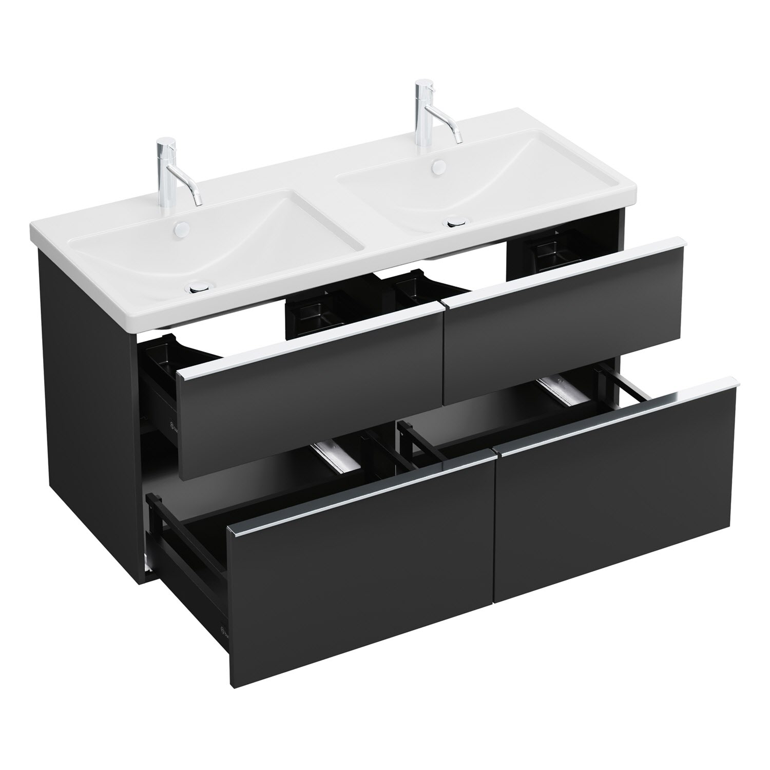 - 2 Schubladen oben, 35 cm tief, mit Siphonausschnitt und Inneneinteilung
