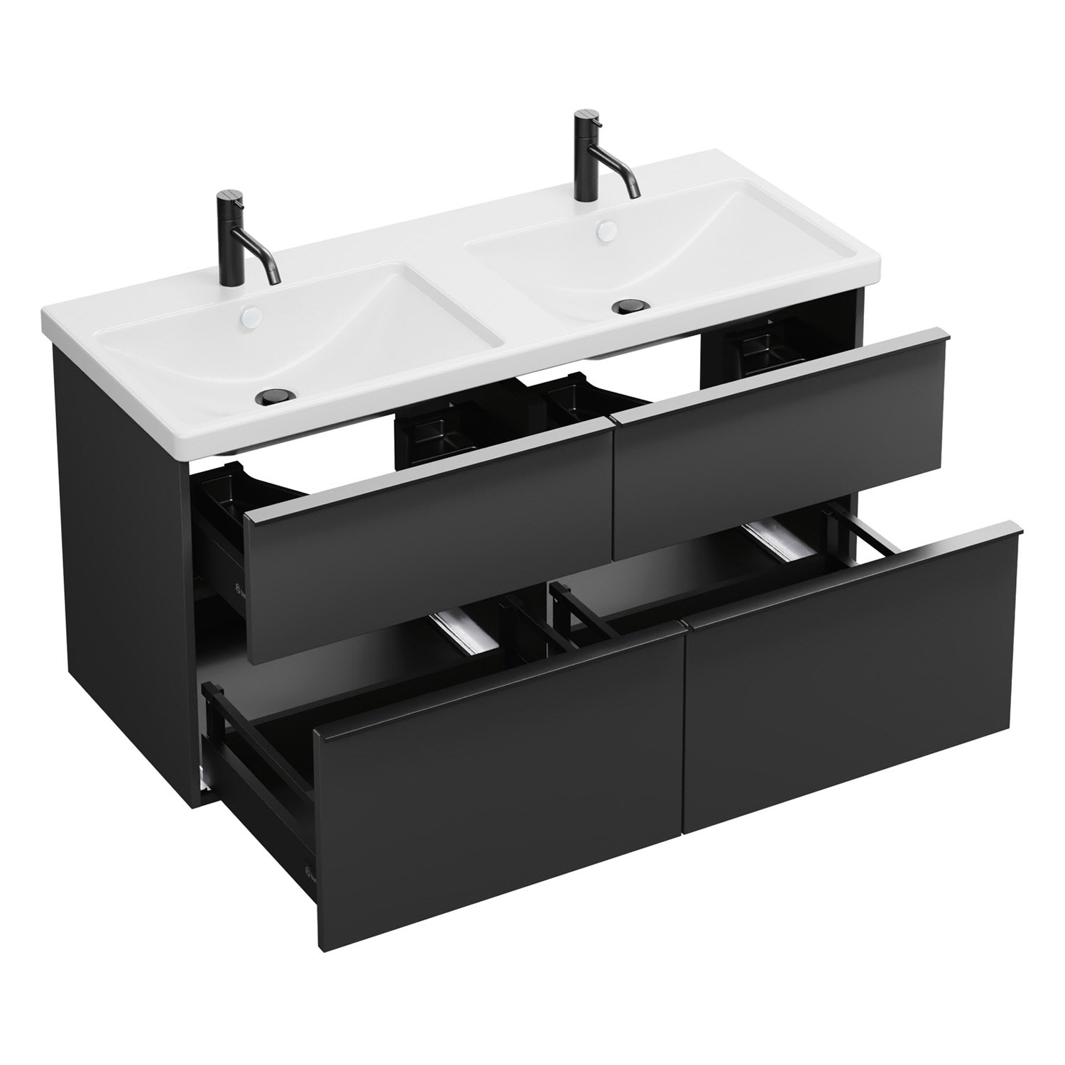 - 2 Schubladen oben, 35 cm tief, mit Siphonausschnitt und Inneneinteilung