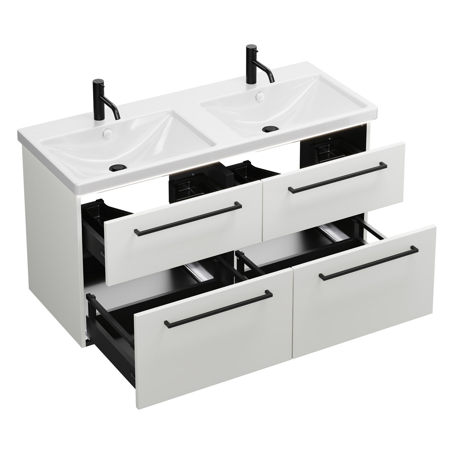- 2 Schubladen oben, 35 cm tief, mit Siphonausschnitt und Inneneinteilung