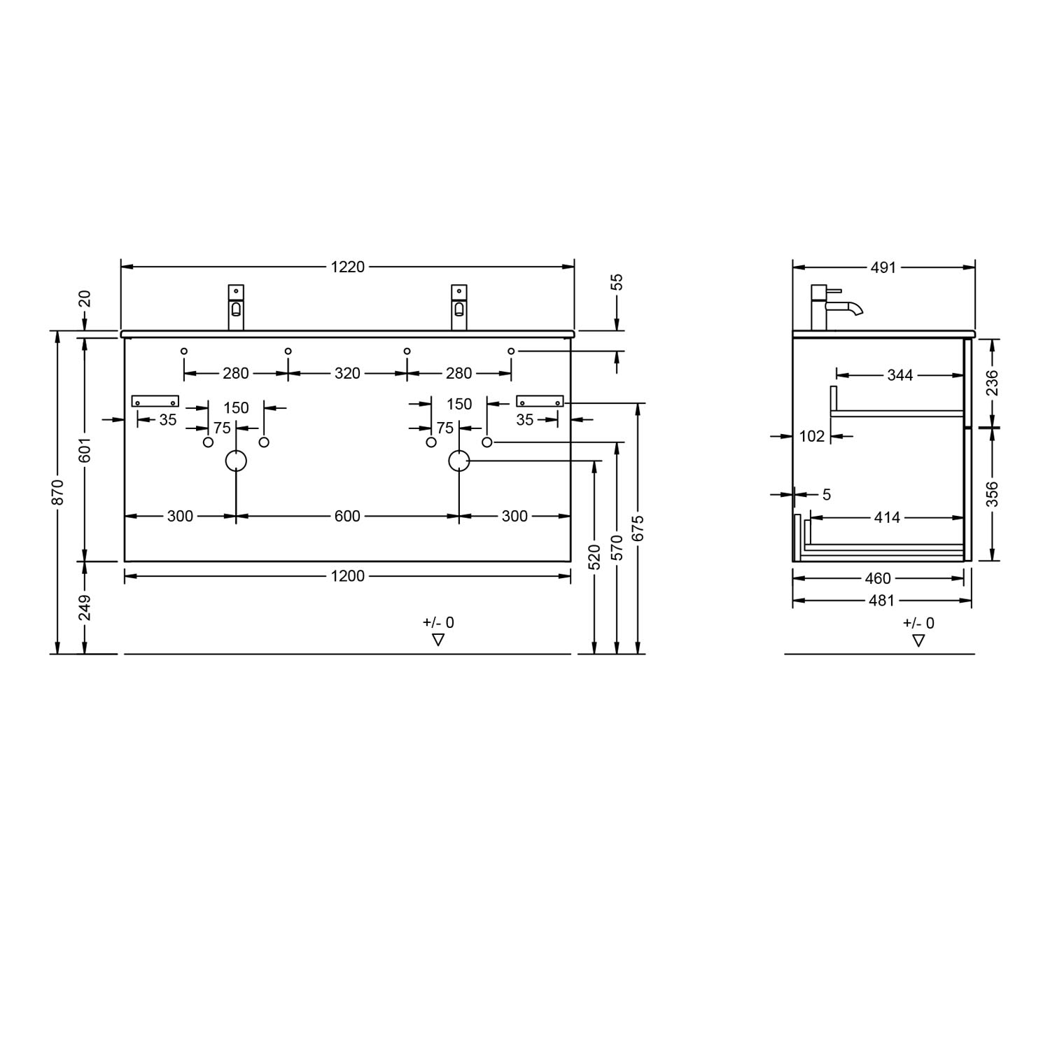 burgbad Eqio Waschtischkombination mit Keramik-Doppelwaschtisch Slim, 122 cm, mit Griffleiste G0252