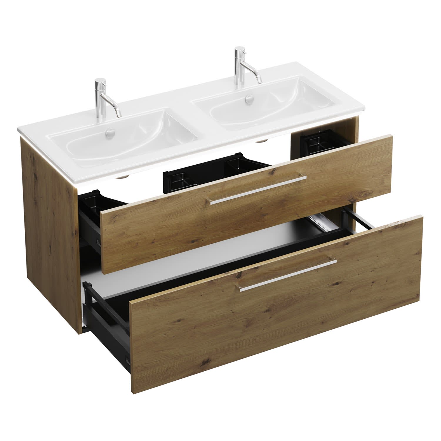 - 1 Schublade oben, 35 cm tief, mit 2 Siphonausschnitten und Inneneinteilung