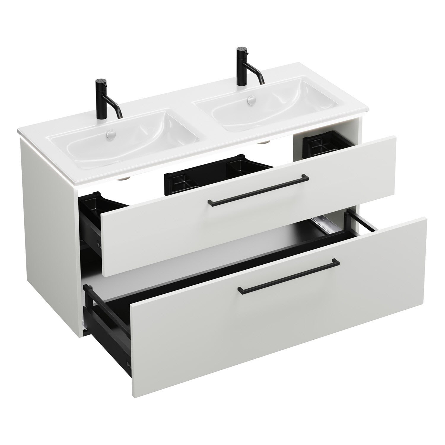 - 1 Schublade oben, 35 cm tief, mit 2 Siphonausschnitten und Inneneinteilung