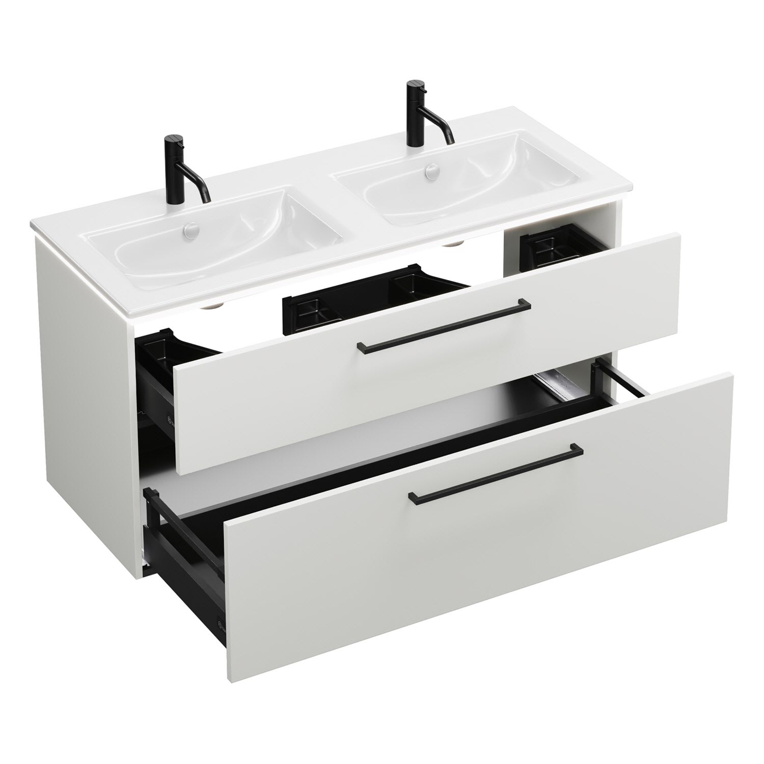- 1 Schublade oben, 35 cm tief, mit 2 Siphonausschnitten und Inneneinteilung