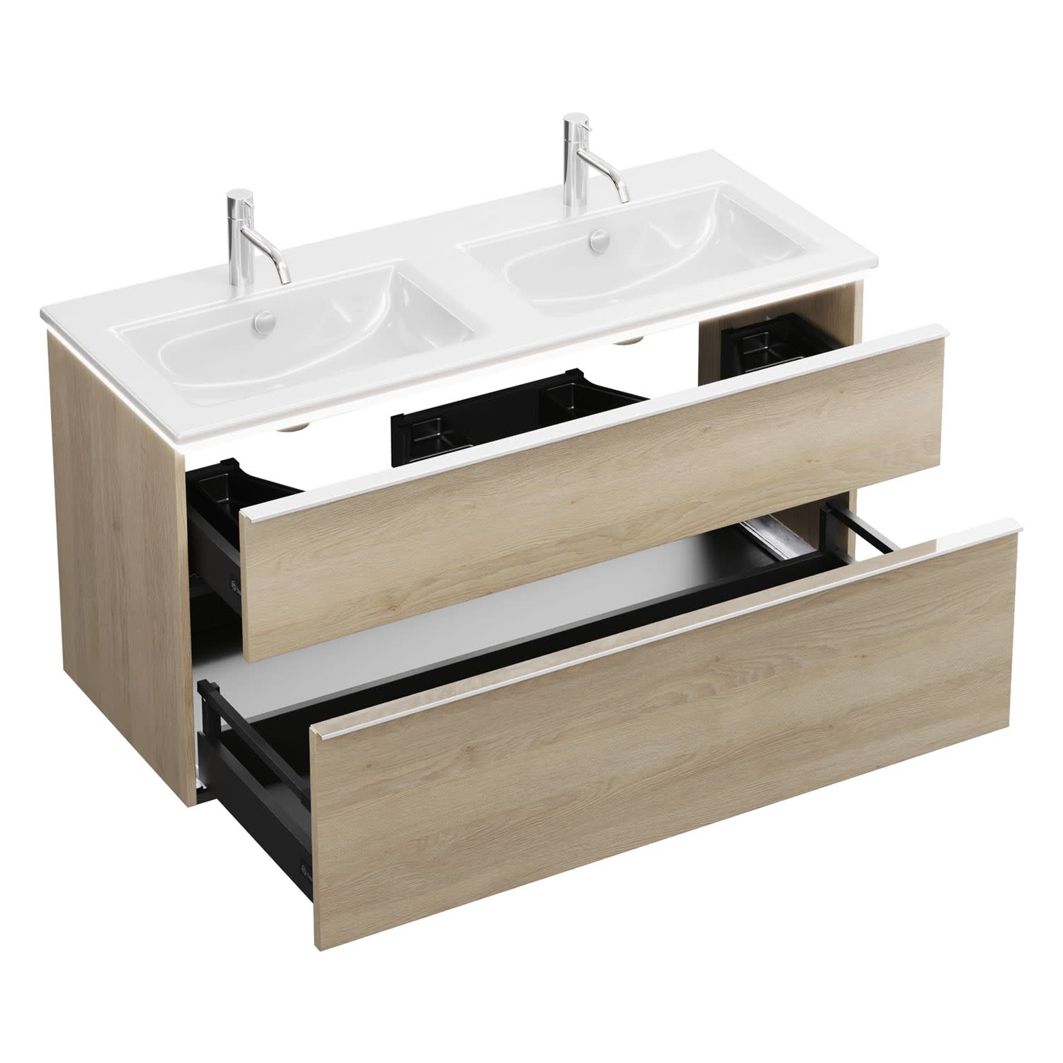 - 1 Schublade oben, 35 cm tief, mit 2 Siphonausschnitten und Inneneinteilung