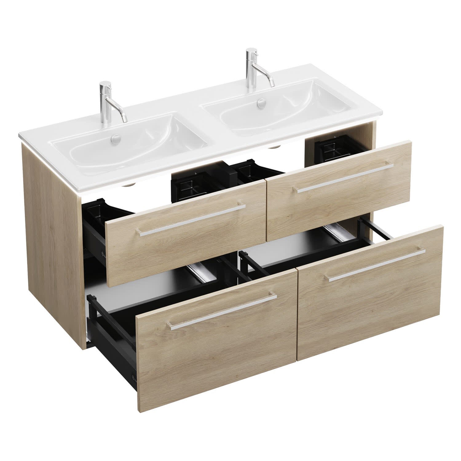 - 2 Schubladen oben, 35 cm tief, mit Siphonausschnitt und Inneneinteilung