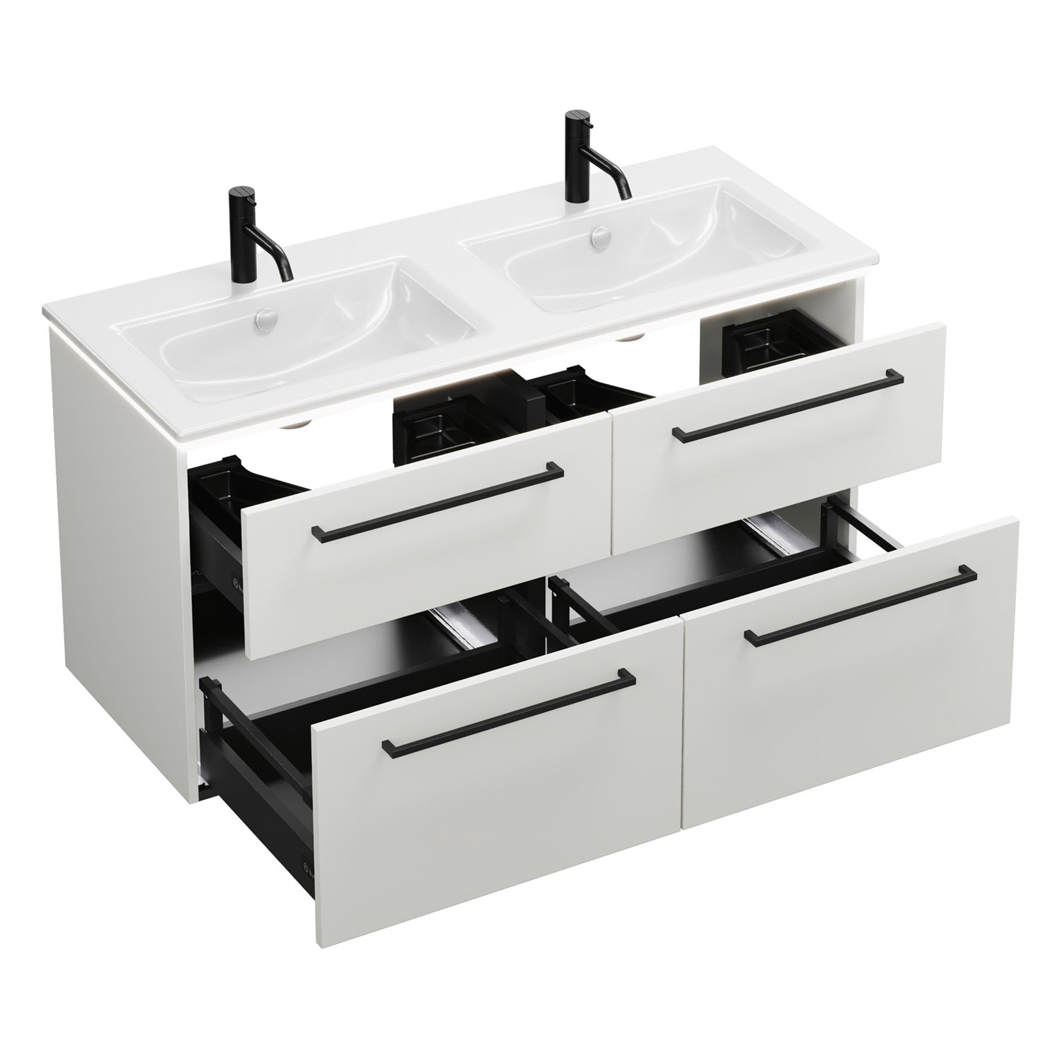 - 2 Schubladen oben, 35 cm tief, mit Siphonausschnitt und Inneneinteilung