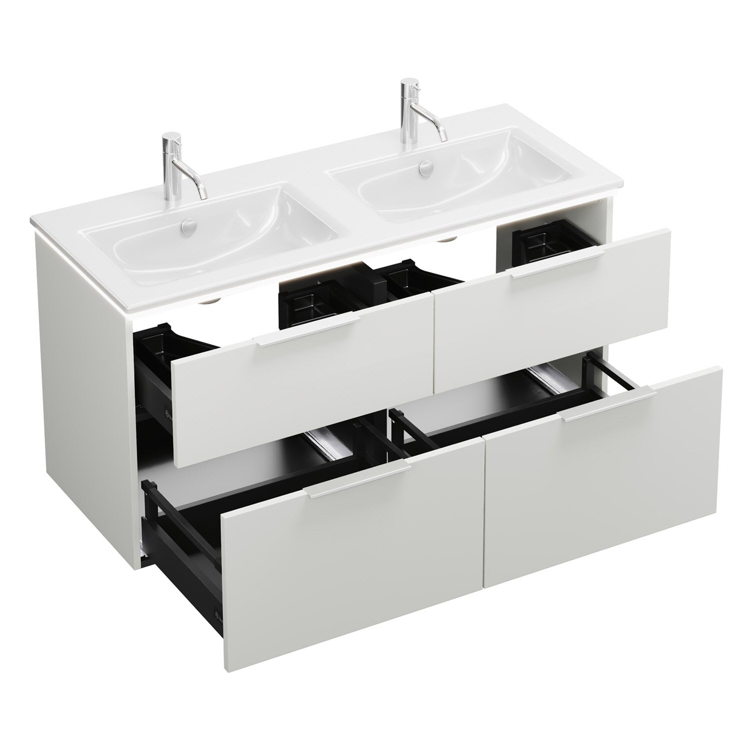 - 2 Schubladen oben, 35 cm tief, mit Siphonausschnitt und Inneneinteilung