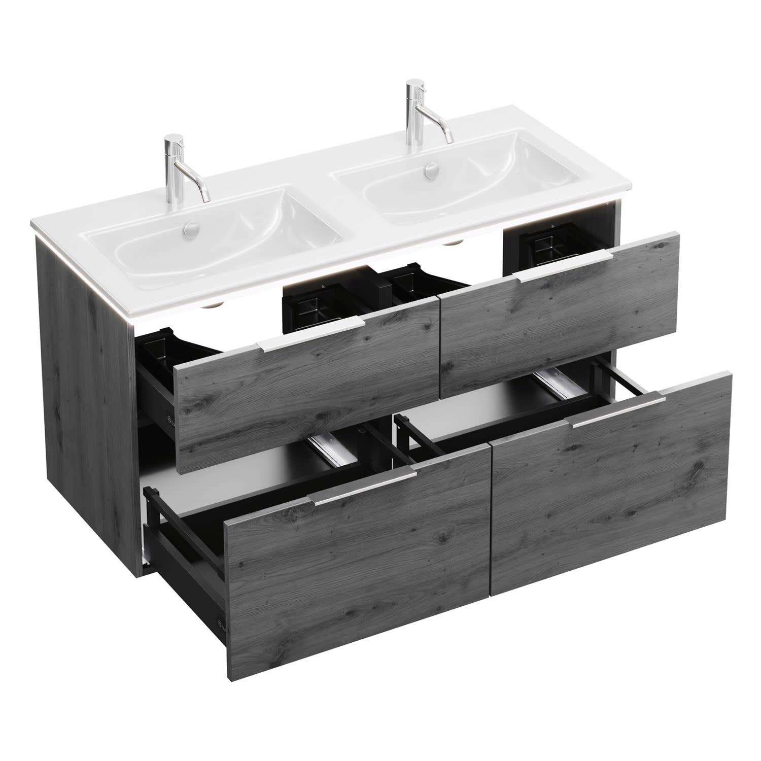 - 2 Schubladen oben, 35 cm tief, mit Siphonausschnitt und Inneneinteilung