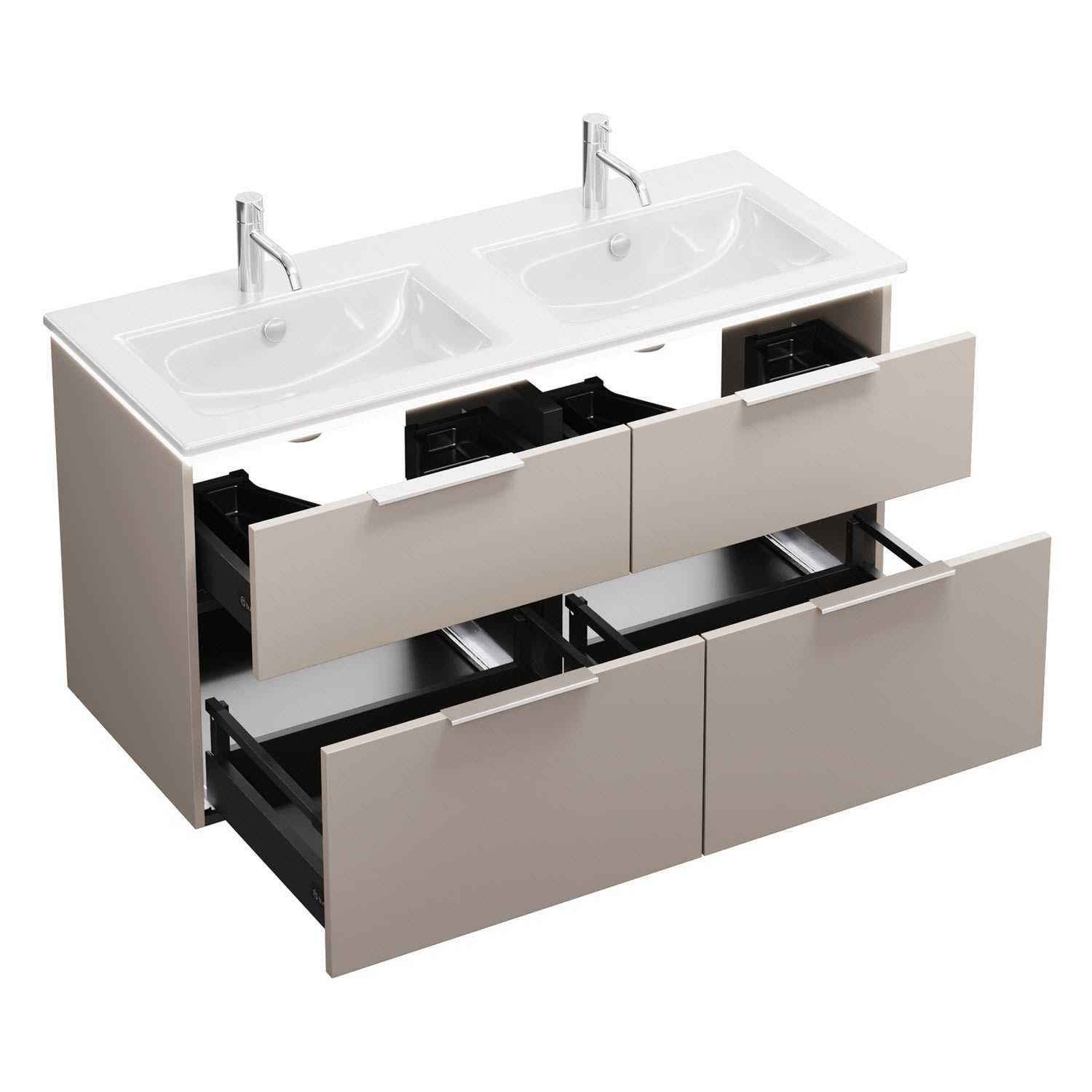 - 2 Schubladen oben, 35 cm tief, mit Siphonausschnitt und Inneneinteilung