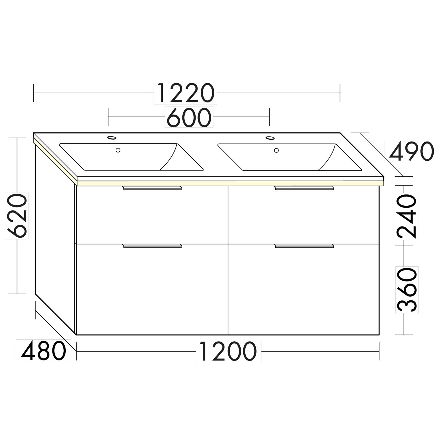 - 2 Schubladen oben, 35 cm tief, mit Siphonausschnitt und Inneneinteilung