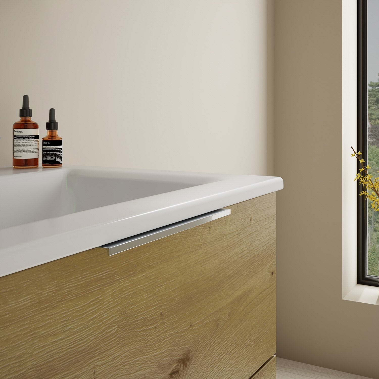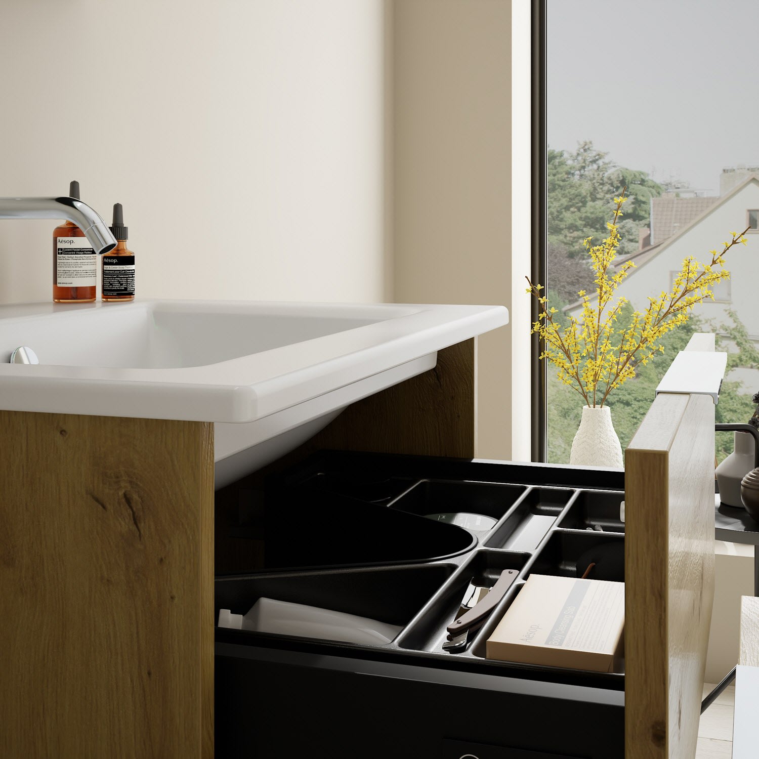 - 1 Schublade oben, 35 cm tief, mit Siphonausschnitt und Inneneinteilung