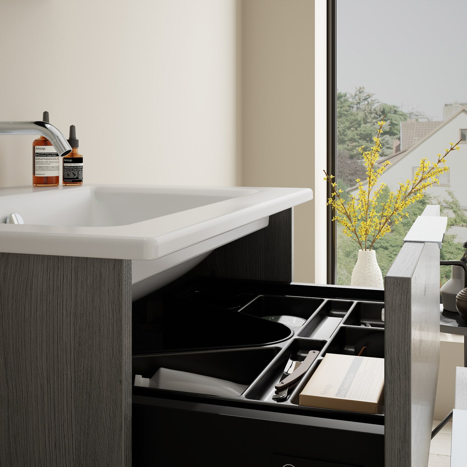 - 1 Schublade oben, 35 cm tief, mit Siphonausschnitt und Inneneinteilung