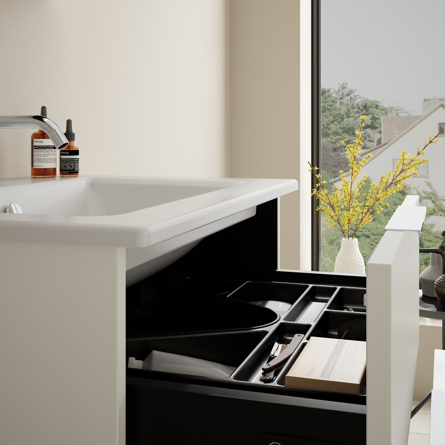 - 1 Schublade oben, 35 cm tief, mit Siphonausschnitt und Inneneinteilung