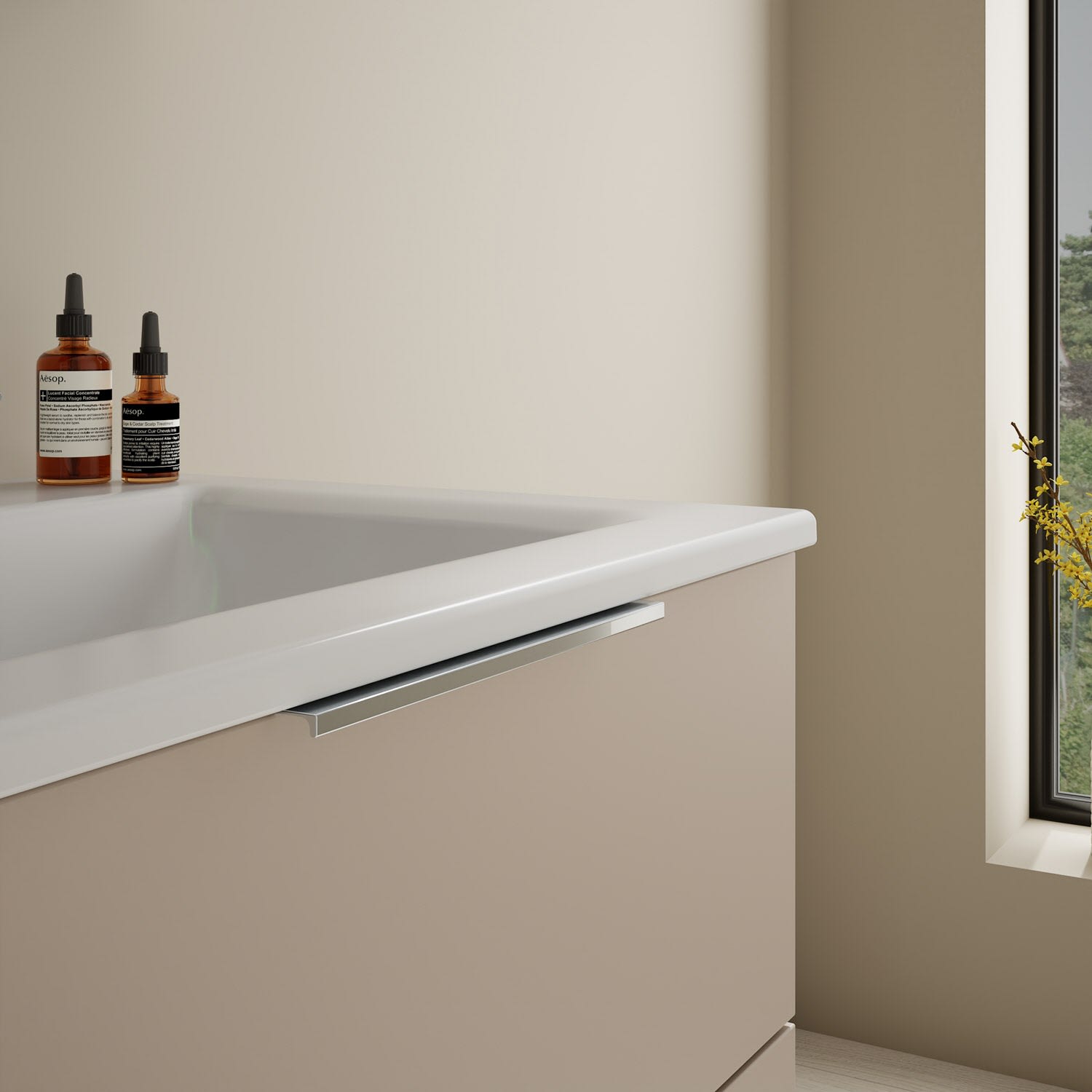 - 1 Schublade oben, 35 cm tief, mit Siphonausschnitt und Inneneinteilung