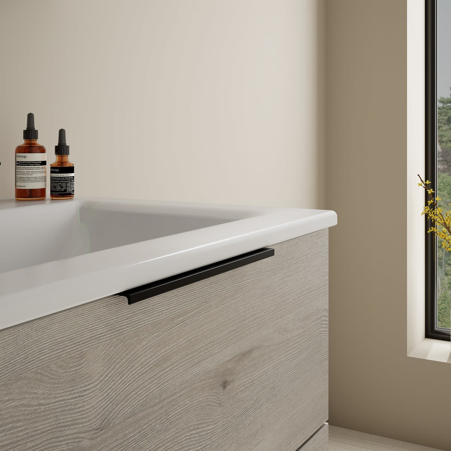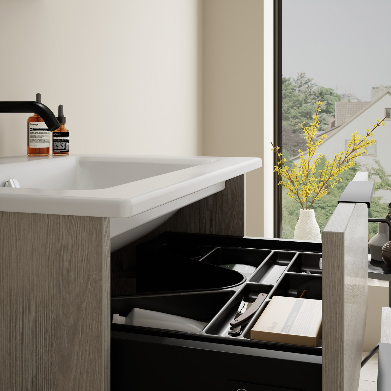- 1 Schublade oben, 35 cm tief, mit Siphonausschnitt und Inneneinteilung