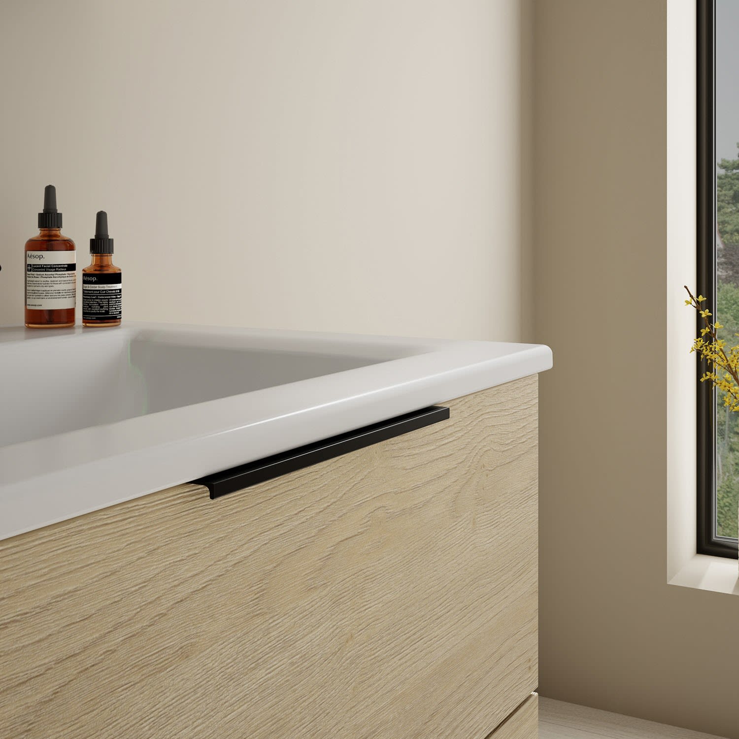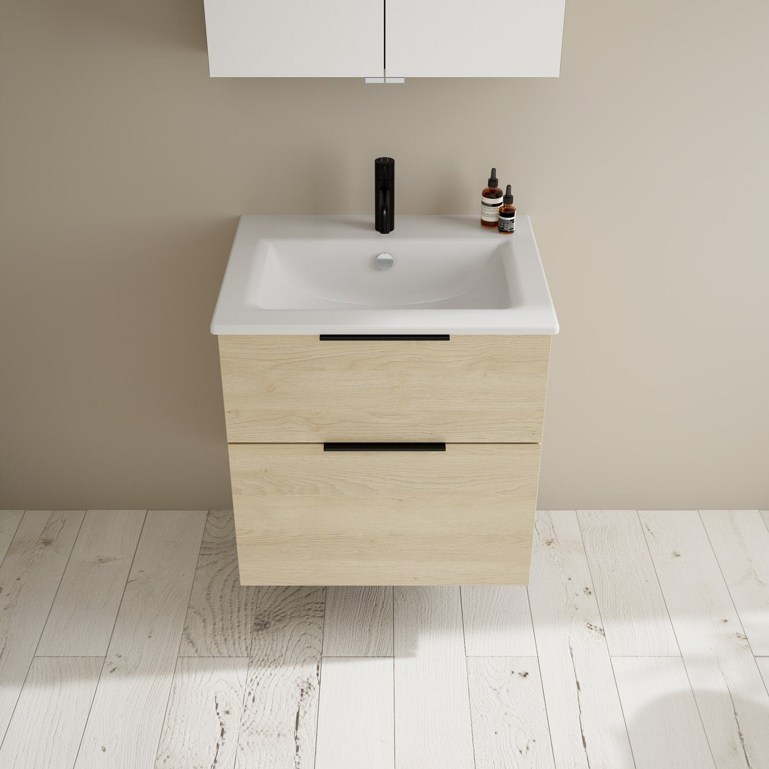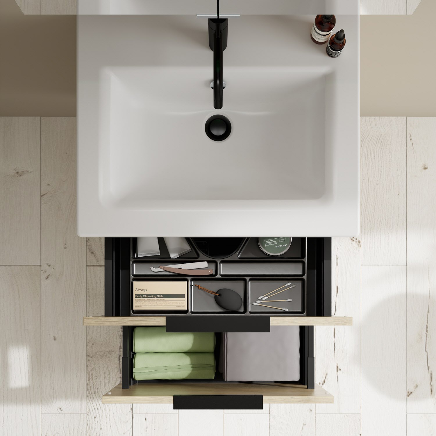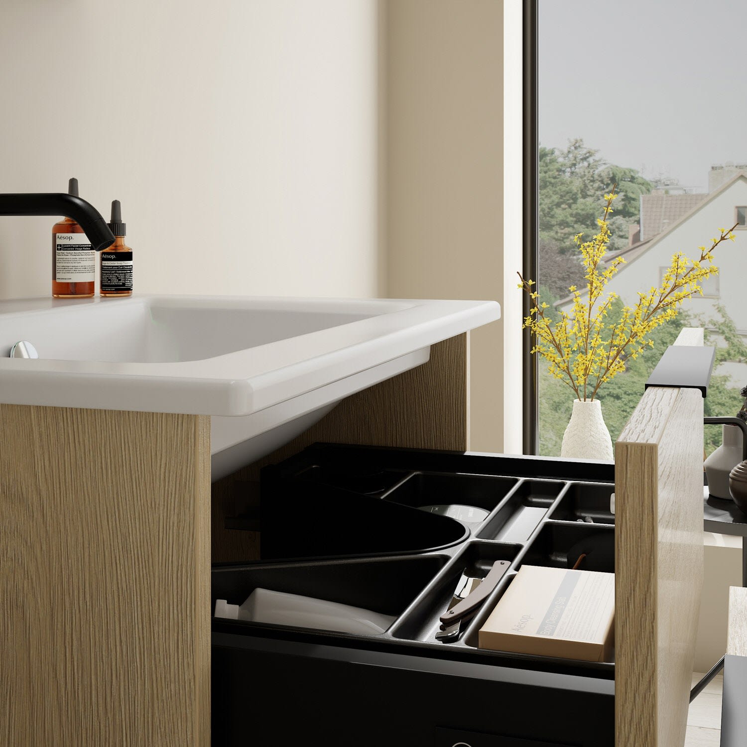 - 1 Schublade oben, 35 cm tief, mit Siphonausschnitt und Inneneinteilung