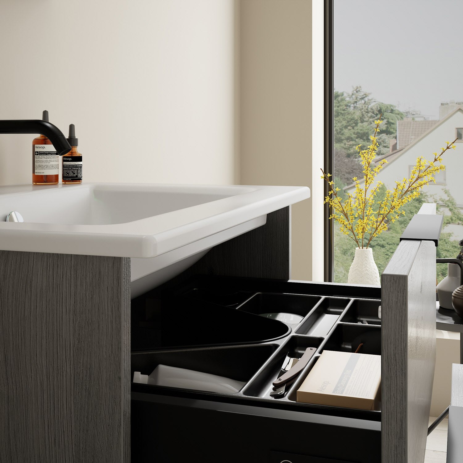- 1 Schublade oben, 35 cm tief, mit Siphonausschnitt und Inneneinteilung