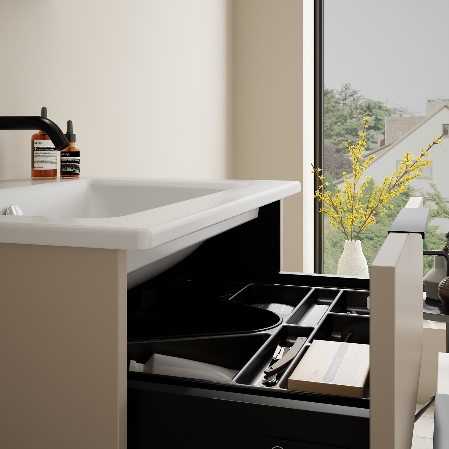 - 1 Schublade oben, 35 cm tief, mit Siphonausschnitt und Inneneinteilung
