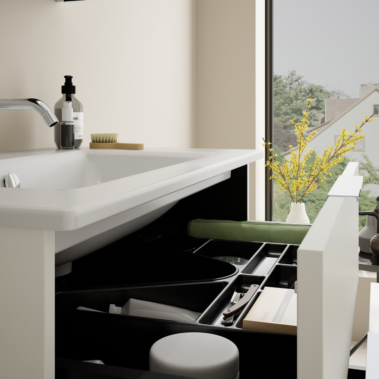 - 1 Schublade oben, 35 cm tief, mit Siphonausschnitt und Inneneinteilung